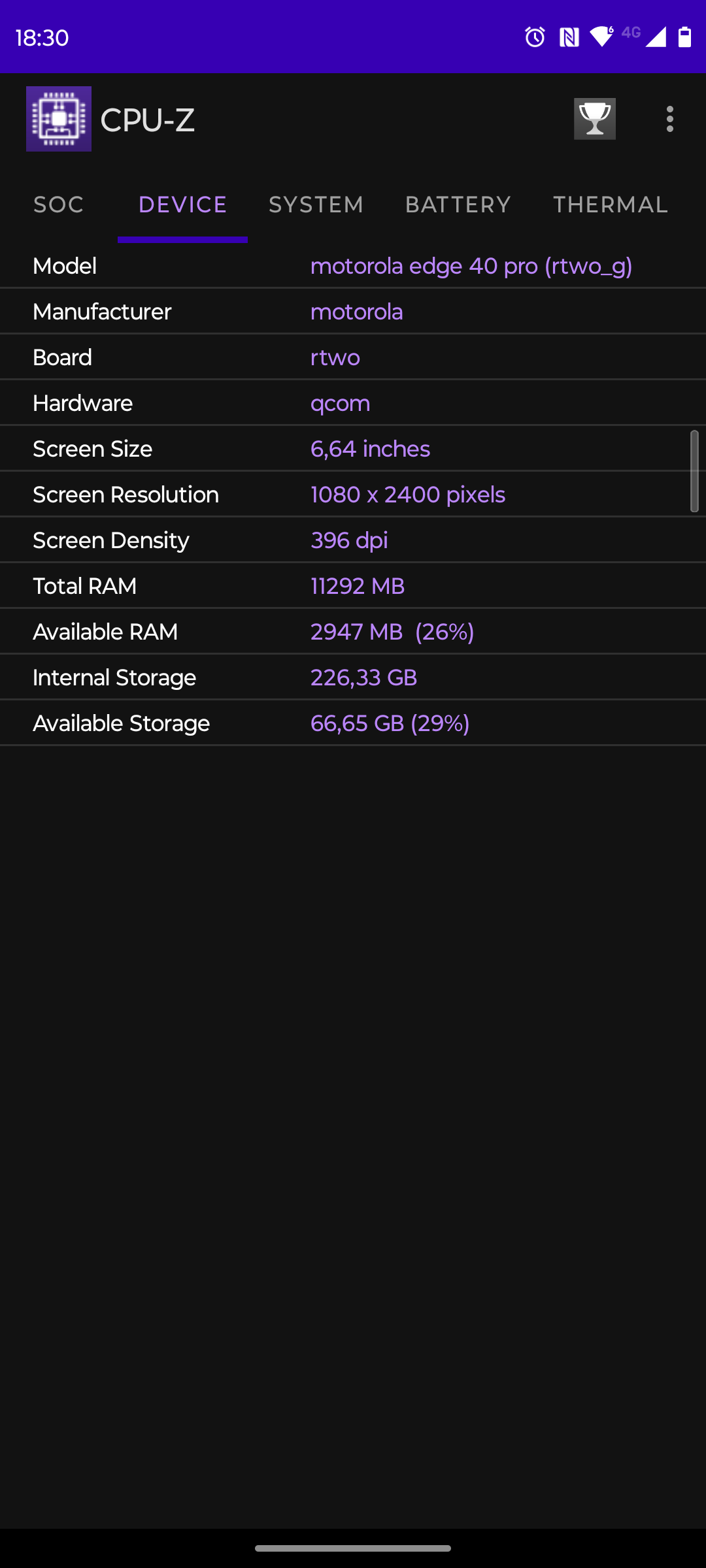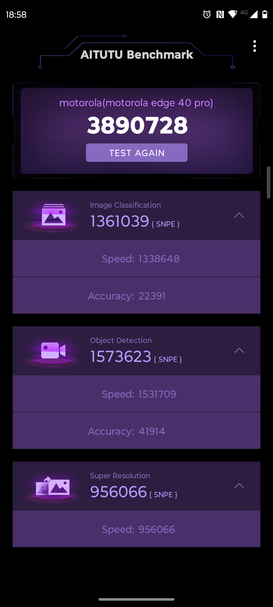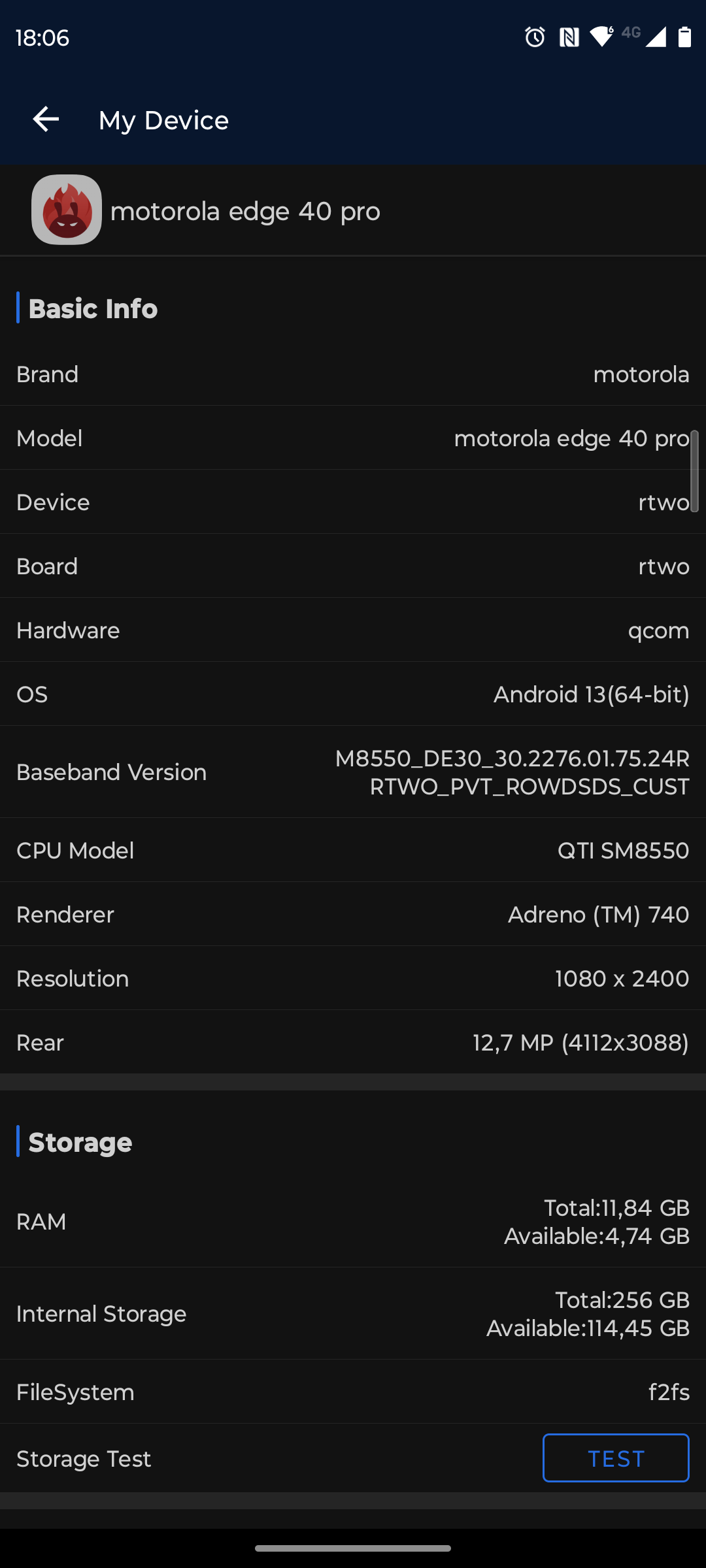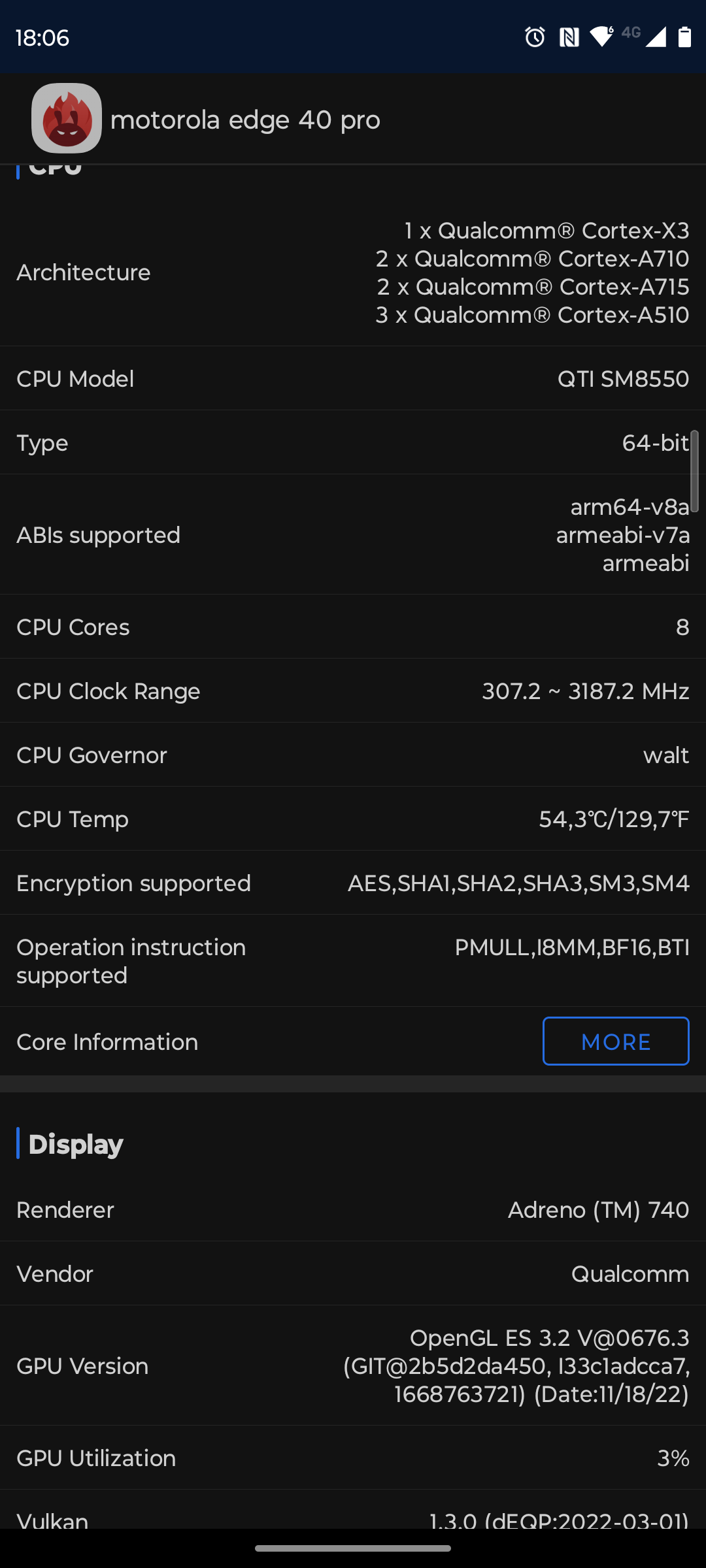 Motorola Edge 40 Pro jest wyposażona w najnowsze flagowe komponenty. Wewnątrz znajduje się najwyższej klasy procesor Qualcomm Snapdragon 8 Gen 2. Jest on produkowany w technologii procesowej 4 nm i zawiera 8 rdzeni w konfiguracji 1+2+2+3: 1xARM Cortex-X3 o taktowaniu 3,19 GHz, 2xCortex-A715 o taktowaniu 2,8 GHz, 2xCortex-A710 o taktowaniu 2,8 GHz i 3xCortex-A510 o taktowaniu 2 GHz. Za grafikę odpowiada akcelerator Adreno 740. Pamięć RAM to 12 GB LPDDR5X. Pamięć wewnętrzna ma pojemność 256 GB, wykorzystując nowy szybki standard UFS 4.0. Motorola Edge 40 Pro jest więc obecnie jednym z najmocniejszych procesorów, co potwierdzają wyniki w testach wydajności.