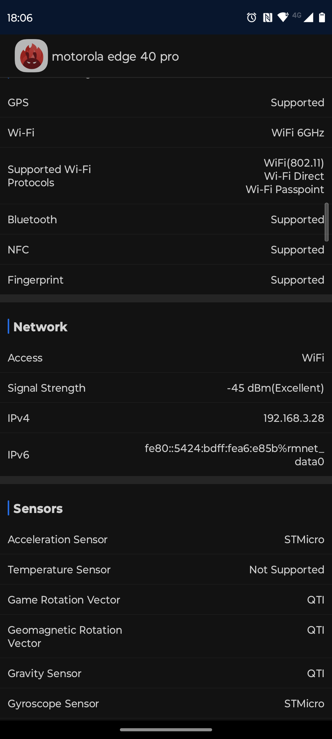 Motorola Edge 40 Pro jest wyposażona we wszystkie nowoczesne interfejsy bezprzewodowe: trójzakresowe Wi-Fi 802.11 a/b/g/n/ac/6e (Wi-Fi 7 ready), Bluetooth 5.3 LE (SBC, AAC, aptX, aptX HD, aptX Adaptive, LDAC) oraz NFC do płatności zbliżeniowych. Dzięki zastosowaniu chipu Qualcomm, oprócz LDAC jest teraz wsparcie dla kodeków aptX, aptX HD. Smartfon jest w stanie współpracować z globalnymi systemami pozycjonowania GPS, GLONASS, GALILEO, BDS, LTEPP, SUPL. Smartfon posiada głośniki stereo. Brzmią one dość głośno i stosunkowo czysto, choć minimalnie brakuje niskich częstotliwości. Ogólnie dźwięk jest dobry, ale są flagowce z mocniejszym dźwiękiem. Smartfon obsługuje Dolby Atmos. W ustawieniach można wybrać indywidualne ustawienia dźwięku z korektorem lub wybrać tryb inteligentny, w którym ustawienia będą się zmieniać automatycznie w zależności od odtwarzanej treści.