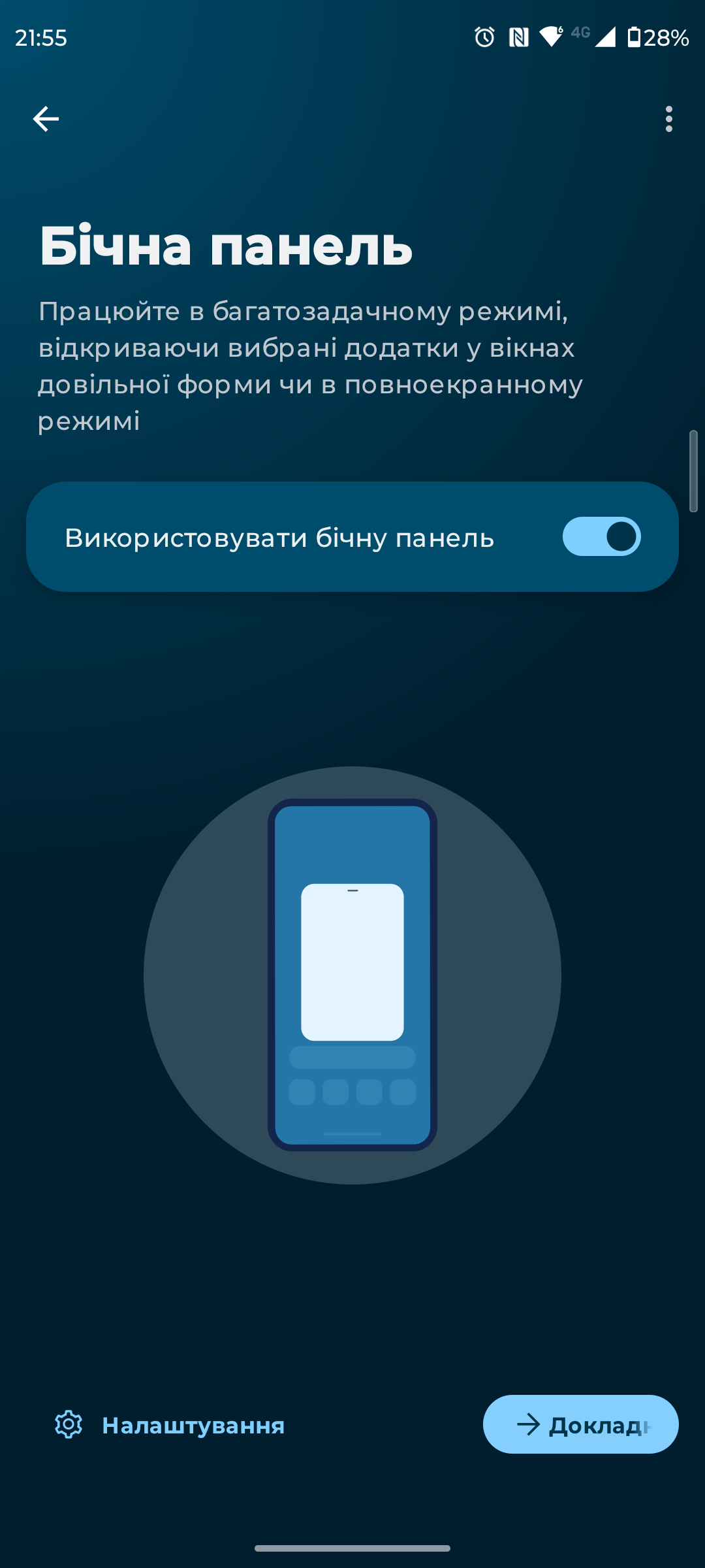 Menedżer aplikacji jest prawie znajomy: karuzela kart. Można z niego uruchomić dwie aplikacje w trybie podzielonego ekranu. Jedyną nietypową i nie do końca logiczną rzeczą jest przycisk minimalizacji ekranu na dole. Zwykle w większości powłok znajduje się przycisk do zamykania wszystkich aplikacji, który jest tam znacznie bardziej odpowiedni.