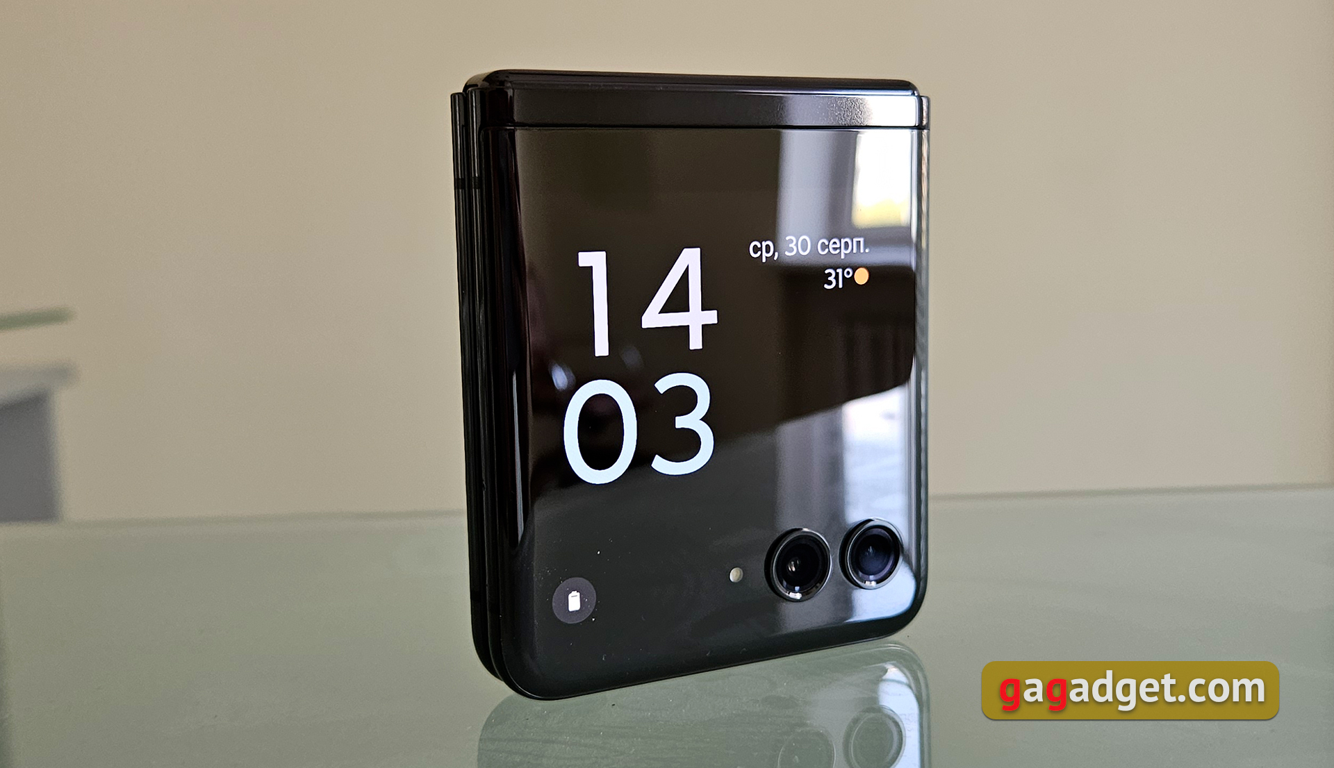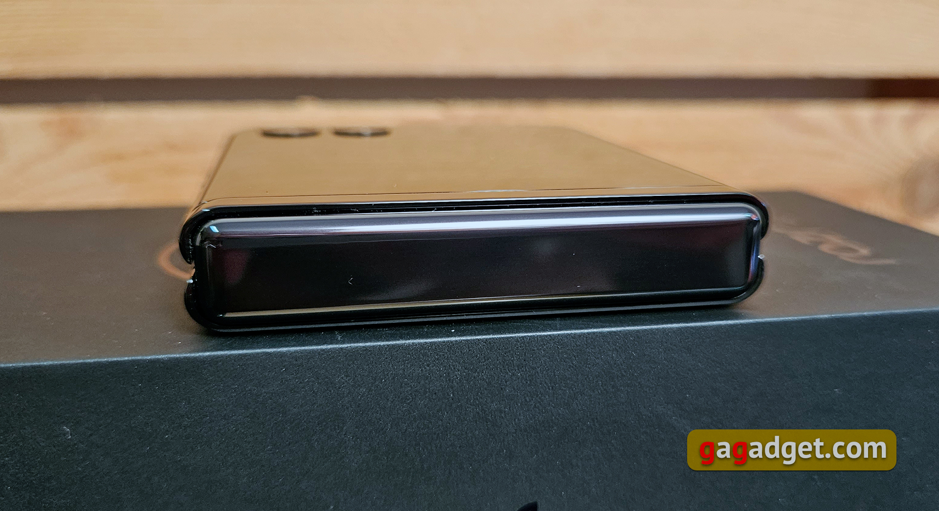 Górna część jest całkowicie błyszcząca i ma efekt lustra, bardziej niż zwykłe szkło ochronne. Wydaje się, że jest to również cecha konstrukcyjna. Jest to zarówno dobre, jak i złe. Zewnętrzny ekran OLED bardzo dobrze pasuje do płaszczyzny pokrywy, a przy użyciu czarnego tła granice wyświetlacza nie są widoczne. Jednak, podobnie jak wszystkie błyszczące powierzchnie, pokrywa bardzo aktywnie zbiera odciski palców. Podwójny aparat jest zintegrowany z zewnętrznym ekranem, a obiektywy wystają nieco ponad powierzchnię. Lampa błyskowa również znajduje się w otworze w ekranie, ale jest prawie niewidoczna.