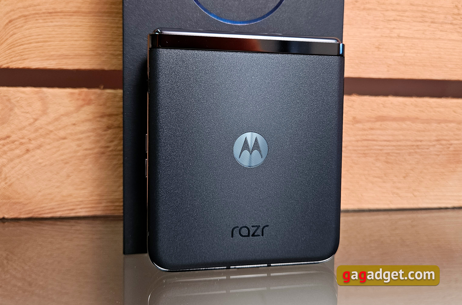 Obie połówki są chronione przez Gorilla Glass Victus, ale są wykończone w zupełnie inny sposób. Dolna część ma bardzo ładną matową fakturę i ciekawie mieni się w słońcu. Pośrodku znajduje się logo Motoroli, a poniżej stylizowany napis Razr.