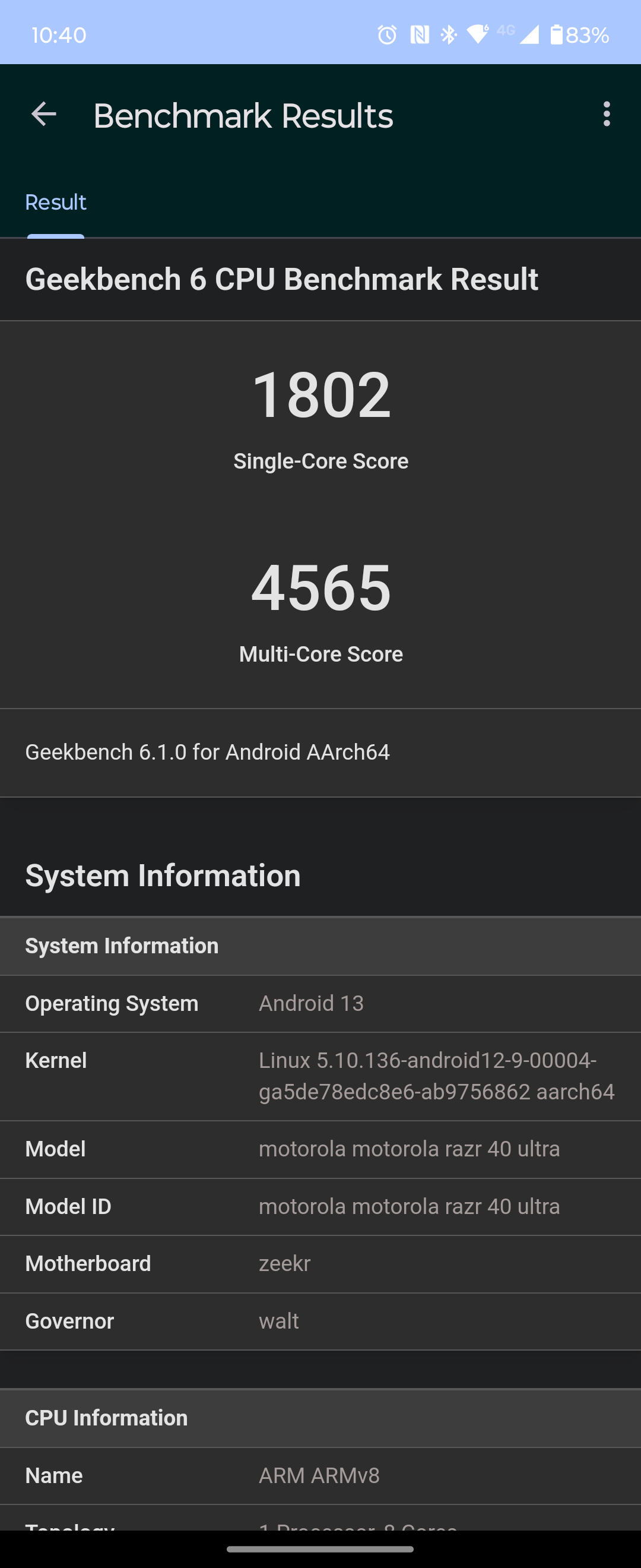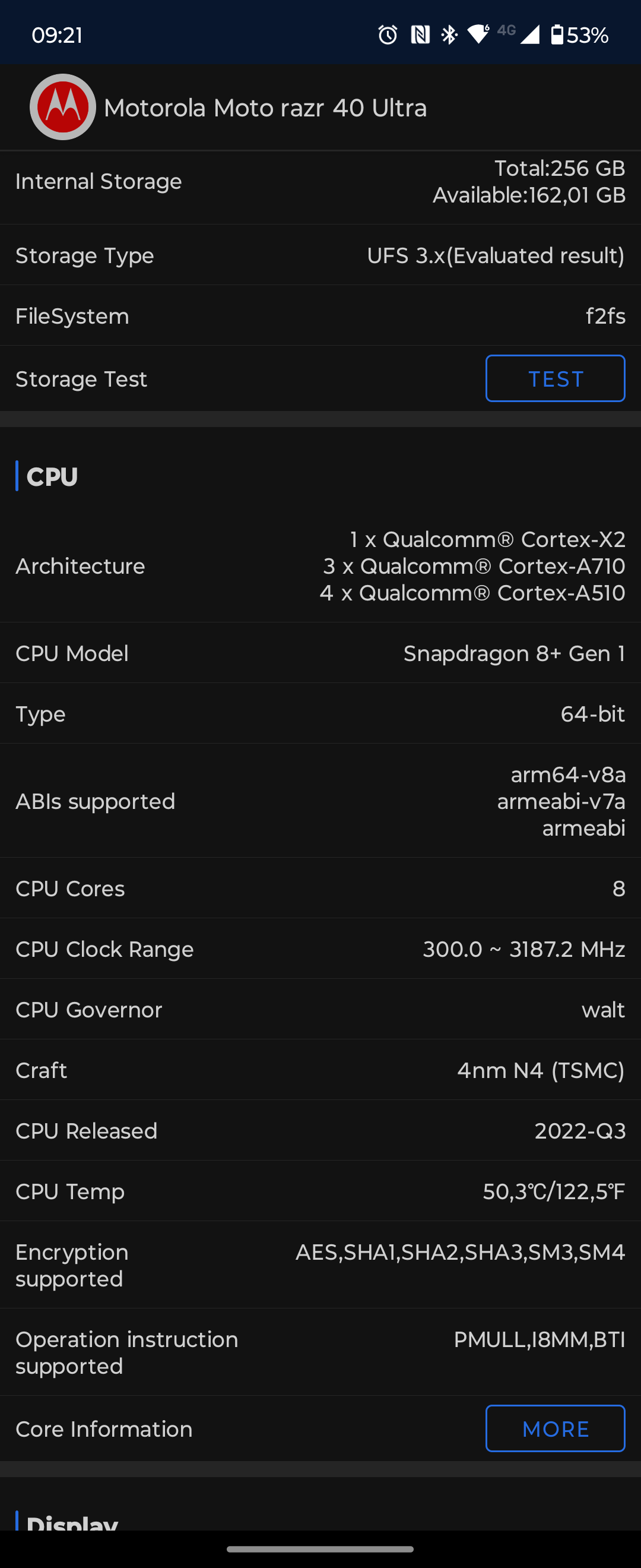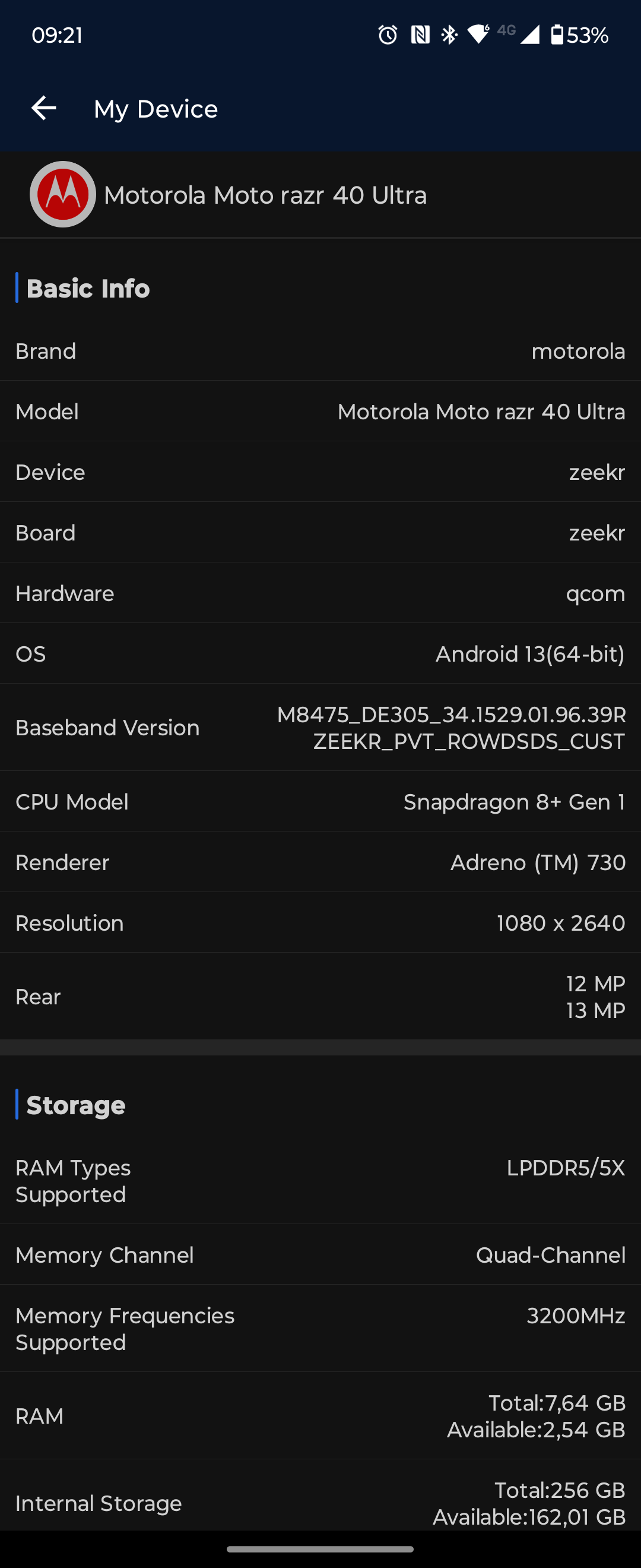 Motorola Razr 40 Ultra ma flagowy procesor Qualcomm Snapdragon 8+ Gen 1, który nie jest już najnowocześniejszy, ale bardzo wydajny. Jest on produkowany w procesie 4 nm, zawiera jeden wysokowydajny rdzeń ARM Cortex-X2 o częstotliwości do 3,19 GHz, trzy rdzenie Cortex-A710 o częstotliwości 2,75 GHz, blok czterech energooszczędnych rdzeni Cortex-A510 o częstotliwości 1,8 GHz oraz akcelerator graficzny Adreno 730. Do dyspozycji jest 8 GB pamięci RAM LPDDR5. Pamięć wewnętrzna: 256 GB UFS 3.1. Smartfon wykazuje wysokie (choć już nie topowe) wyniki w testach syntetycznych. Wydajność jest wystarczająca do wygodnej pracy i nowoczesnych gier. I wystarczy na kilka następnych lat.