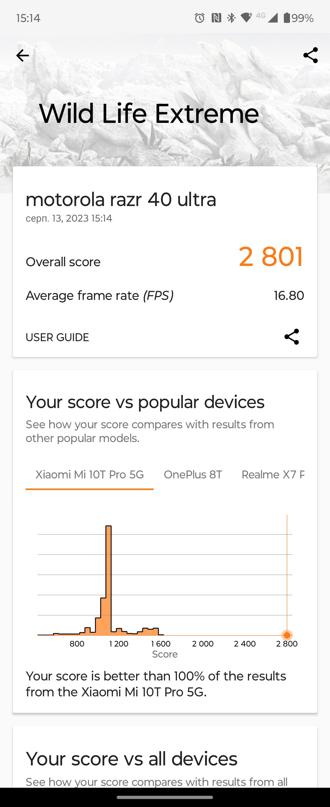 Podobnie jak inne smartfony firmy, Motorola Razr 40 Ultra ma autorską aplikację do gier. Ma ustawienia wydajności, wycisza powiadomienia podczas gry, blokuje poziom jasności, robi zrzuty ekranu i wiele więcej. Wszystkie nowoczesne gry działają dobrze na smartfonie. Call of Duty Mobile i XCOM 2 nie miały problemów na maksymalnych ustawieniach, a smartfon prawie się nie nagrzewał. Diablo Immortal również wizualnie działa przy stabilnych (lub względnie stabilnych) 60 FPS, ale po około 10 minutach gry obudowa znacznie się nagrzewała.