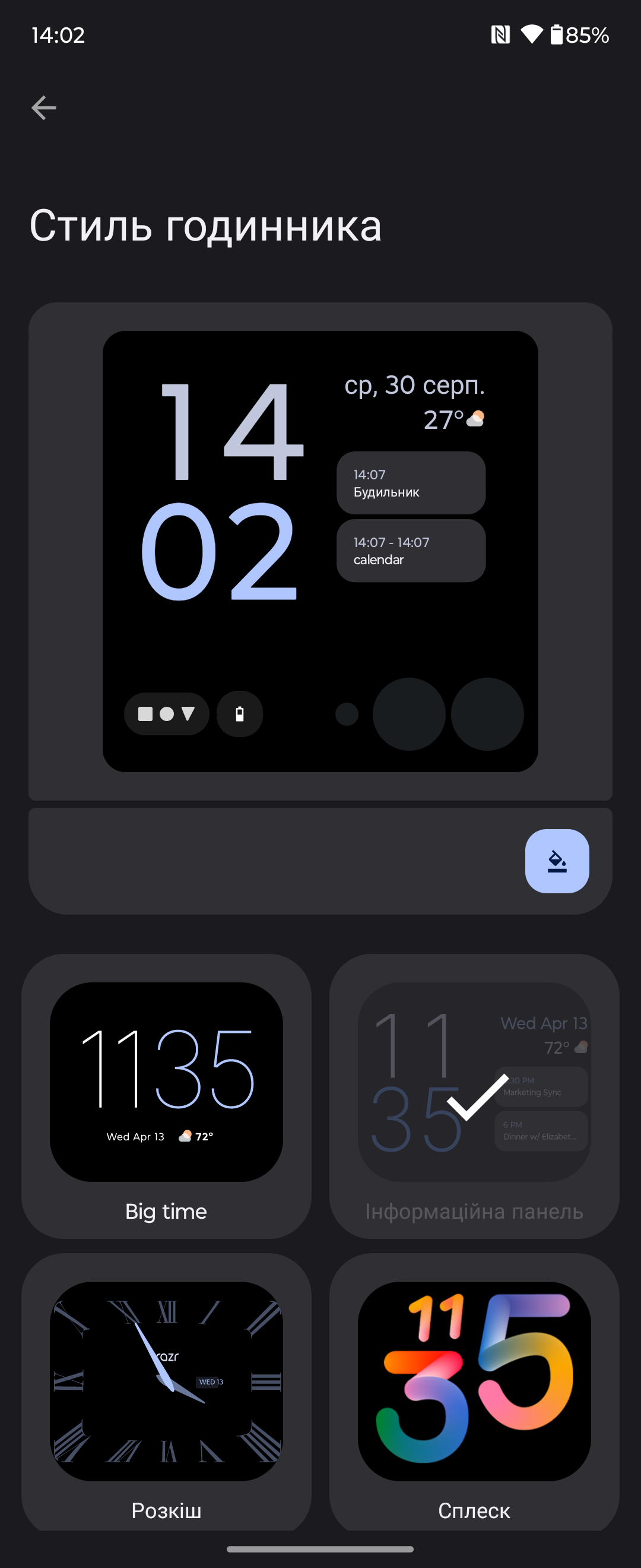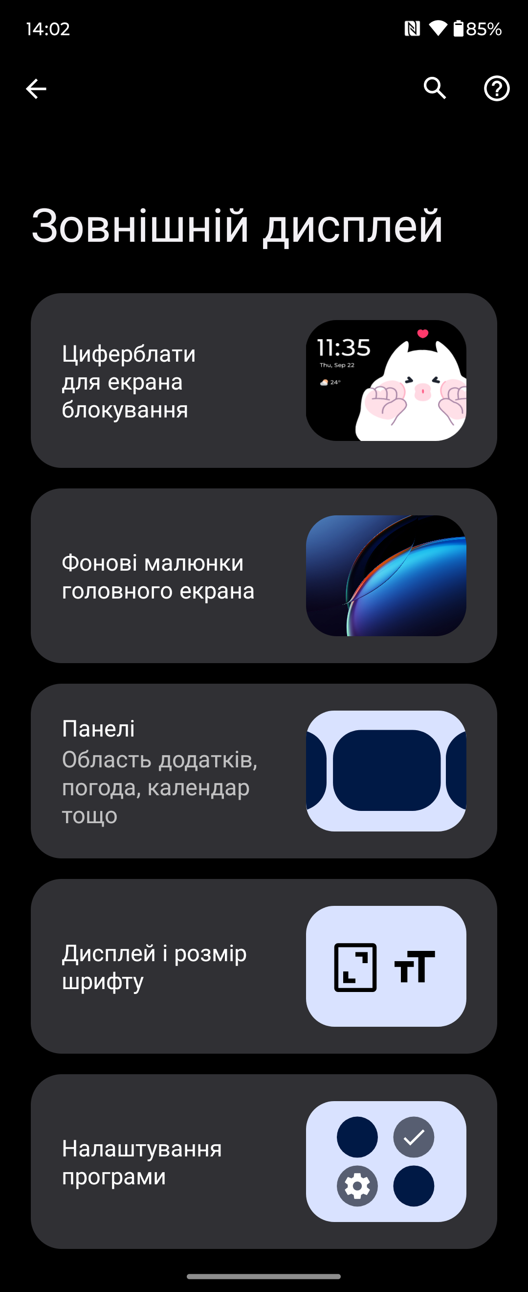 Przejdźmy teraz do wyświetlacza zewnętrznego. Jest znacznie bardziej interesujący dzięki dużej przekątnej 3,6 cala. Ekran zewnętrzny ma do 8 pulpitów (a raczej widżetów) z własnym przeznaczeniem. Kontakty, pogoda, lista aplikacji, odtwarzacz muzyki (niestety natywny widżet jest tylko dla Spotify, chociaż inne odtwarzacze działają dobrze), kalendarz itp.