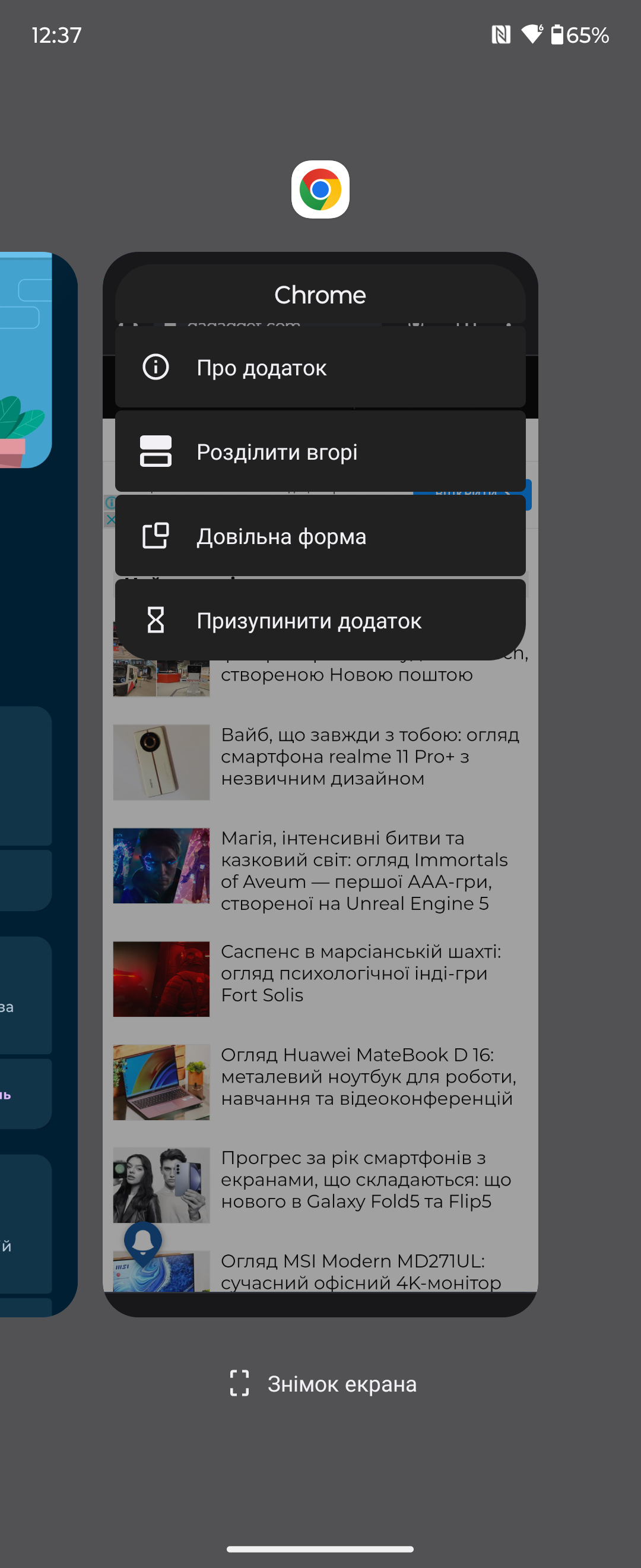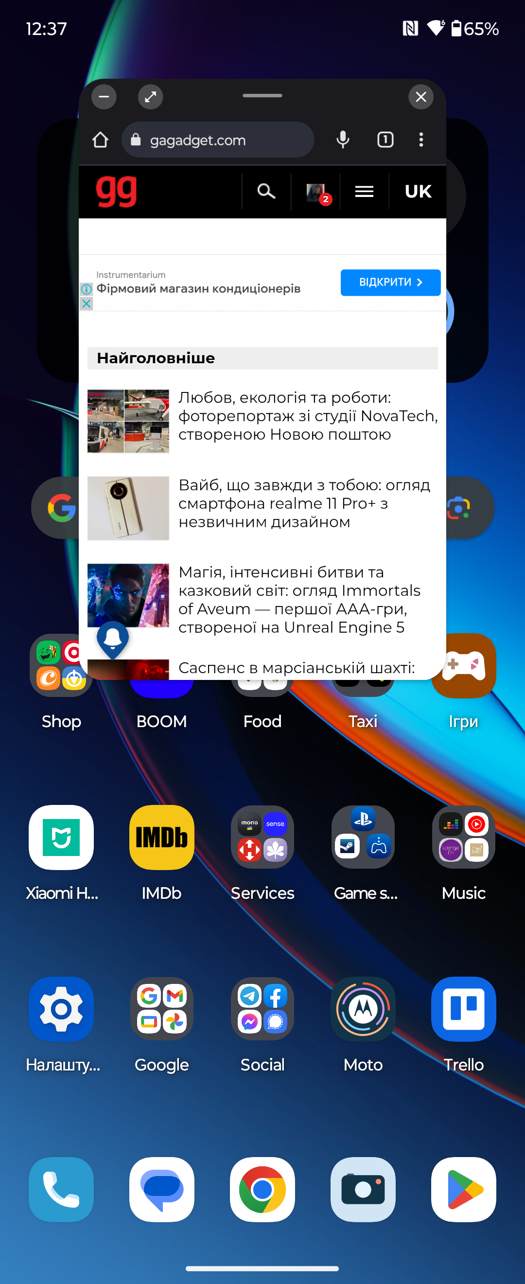 Menedżer aplikacji jest prawie standardowy, w postaci poziomej karuzeli kart. Jest tryb dzielenia ekranu, który pozwala uruchamiać aplikacje w oknie i minimalizować je do ikony. Jedyne, co nie jest zbyt wygodne (podobnie jest w Motorola Edge 40 Pro ). Przycisk na dole menadżera aplikacji odpowiada za zrobienie zrzutu ekranu, a nie za zamknięcie wszystkiego co jest uruchomione.