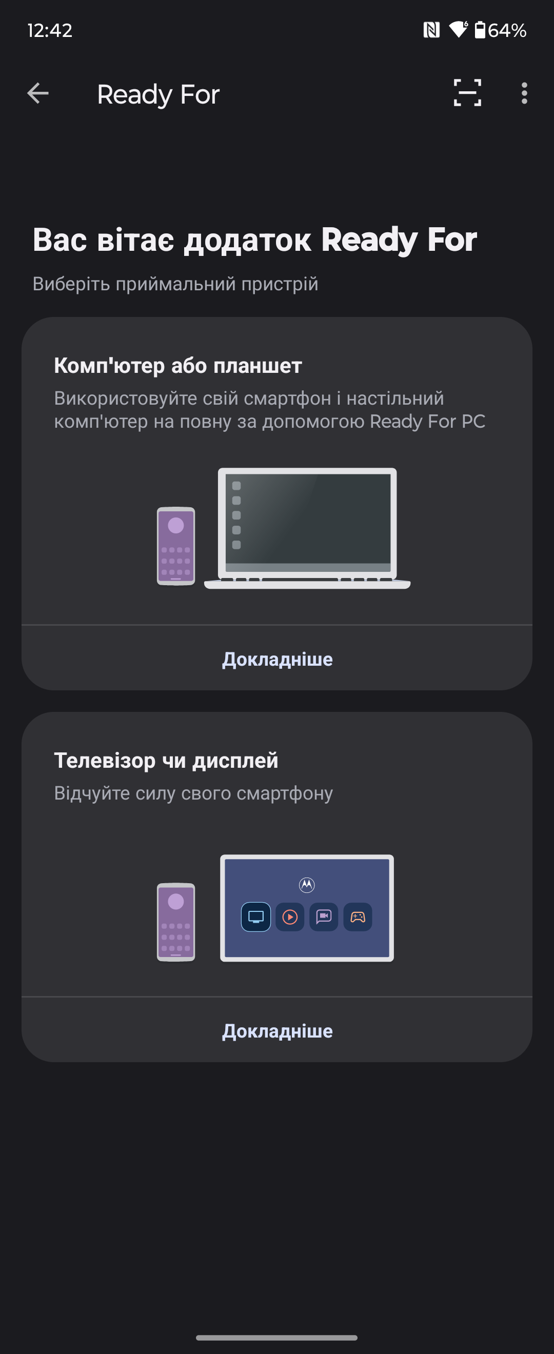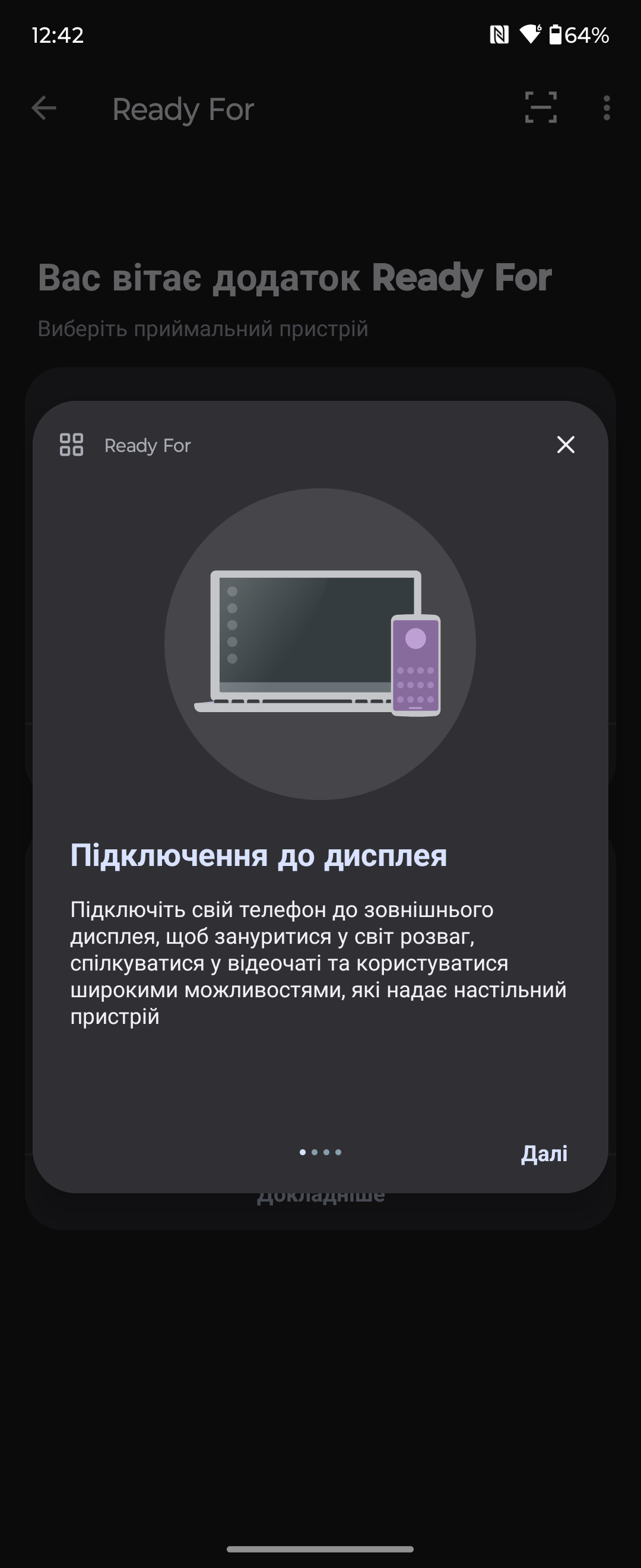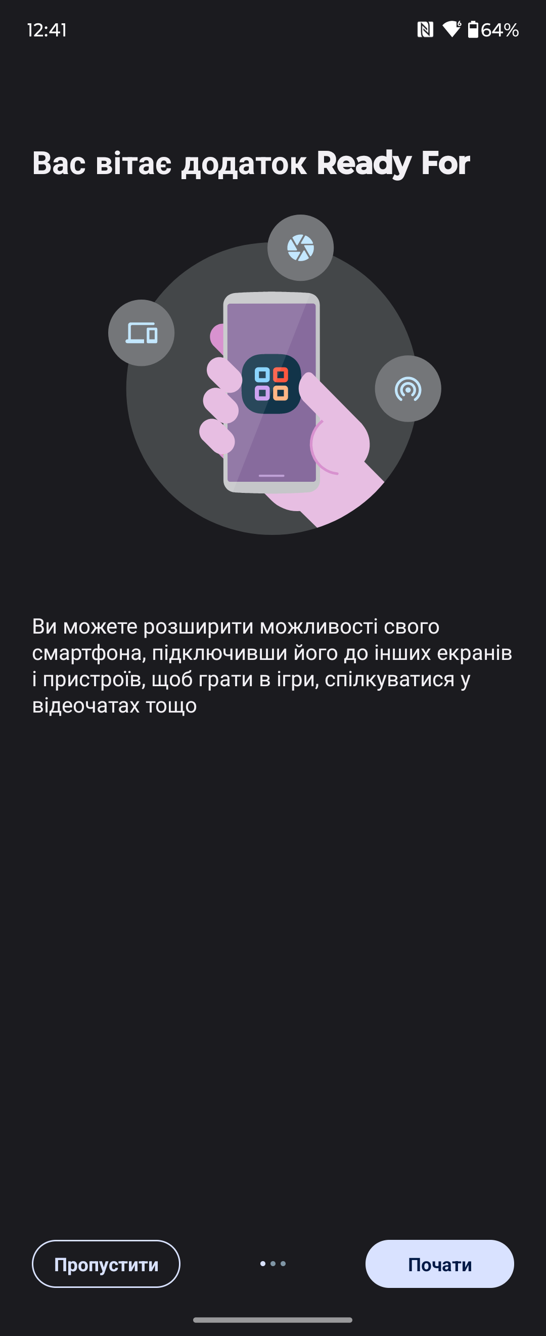 Smartfon obsługuje tryb Ready For desktop. Można go podłączyć do zewnętrznego monitora lub telewizora. Dostępny jest tryb z pulpitem podobnym do systemu Windows oraz tryb rozrywkowy z telewizją (usługi wideo online), grą, czatem wideo (przy użyciu smartfona jako kamery internetowej) i odbiciem lustrzanym obrazu smartfona. Można podłączyć klawiaturę, mysz lub gamepad przez Bluetooth, a także używać ekranu smartfona jako touchpada.