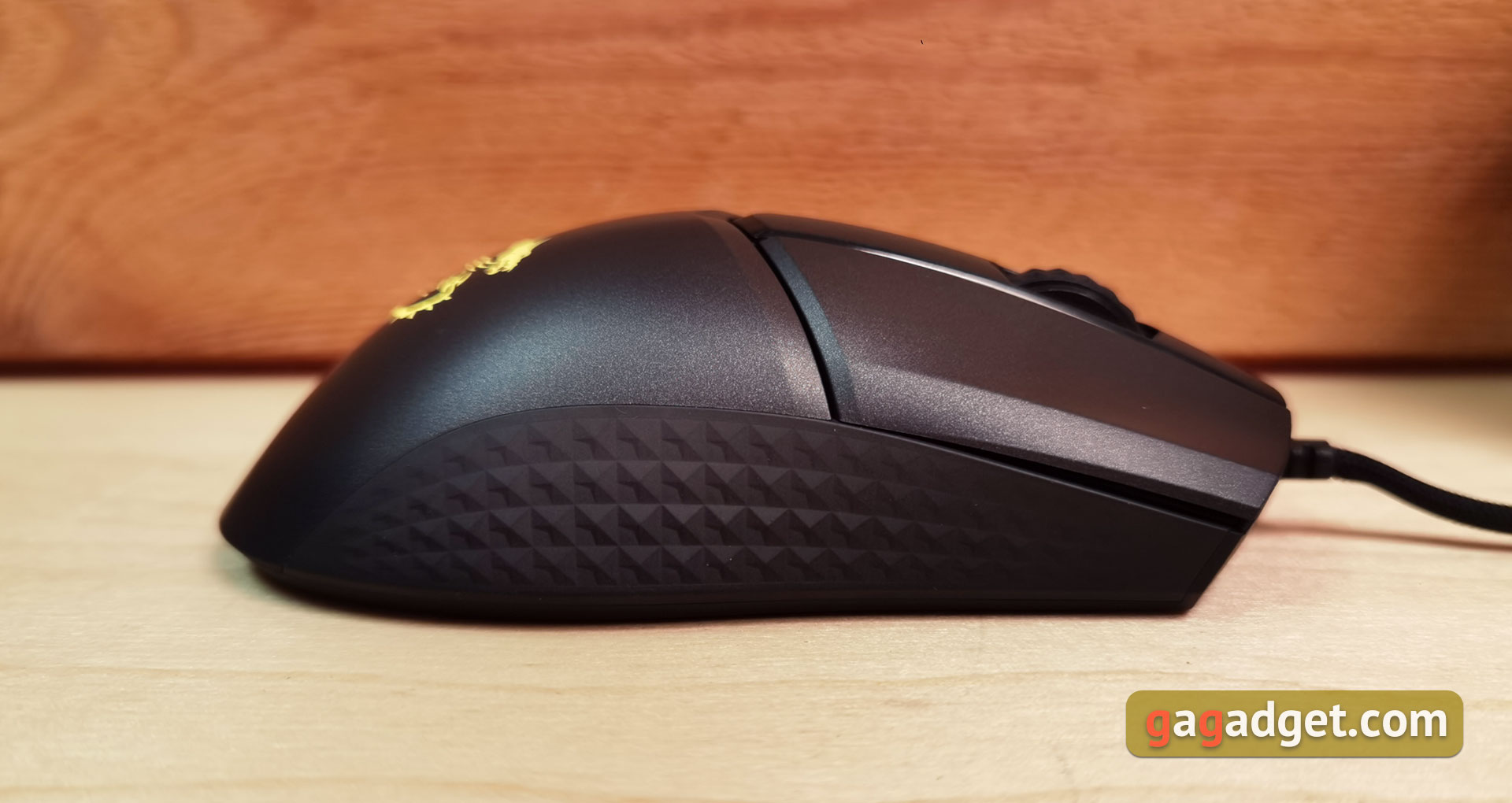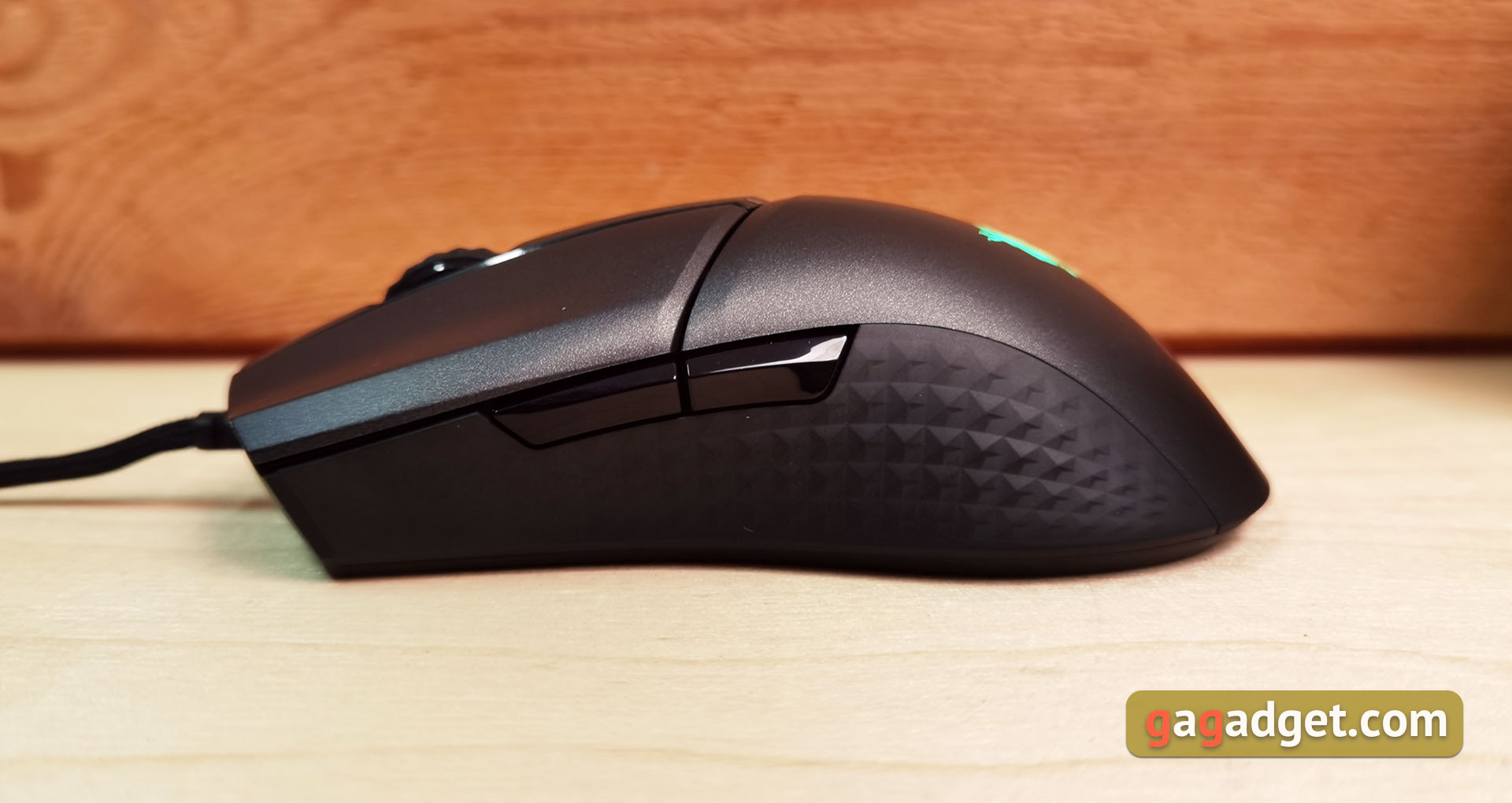 Boki mają gumową powłokę z teksturą, która pomaga pewniej trzymać mysz podczas użytkowania. Dodatkowe przyciski są błyszczące, mają standardowy kształt, ale separacja między nimi jest prawie niewyczuwalna.