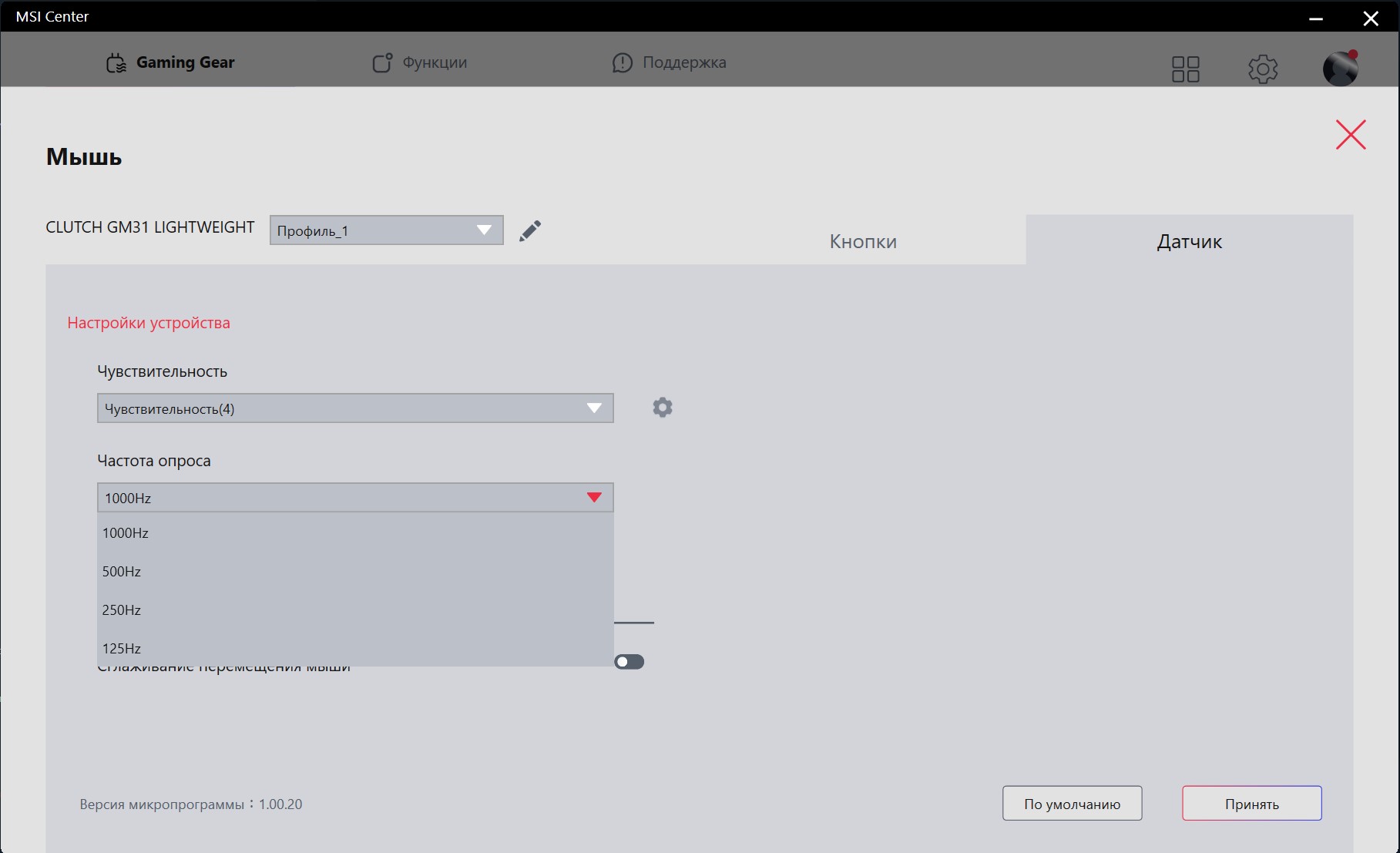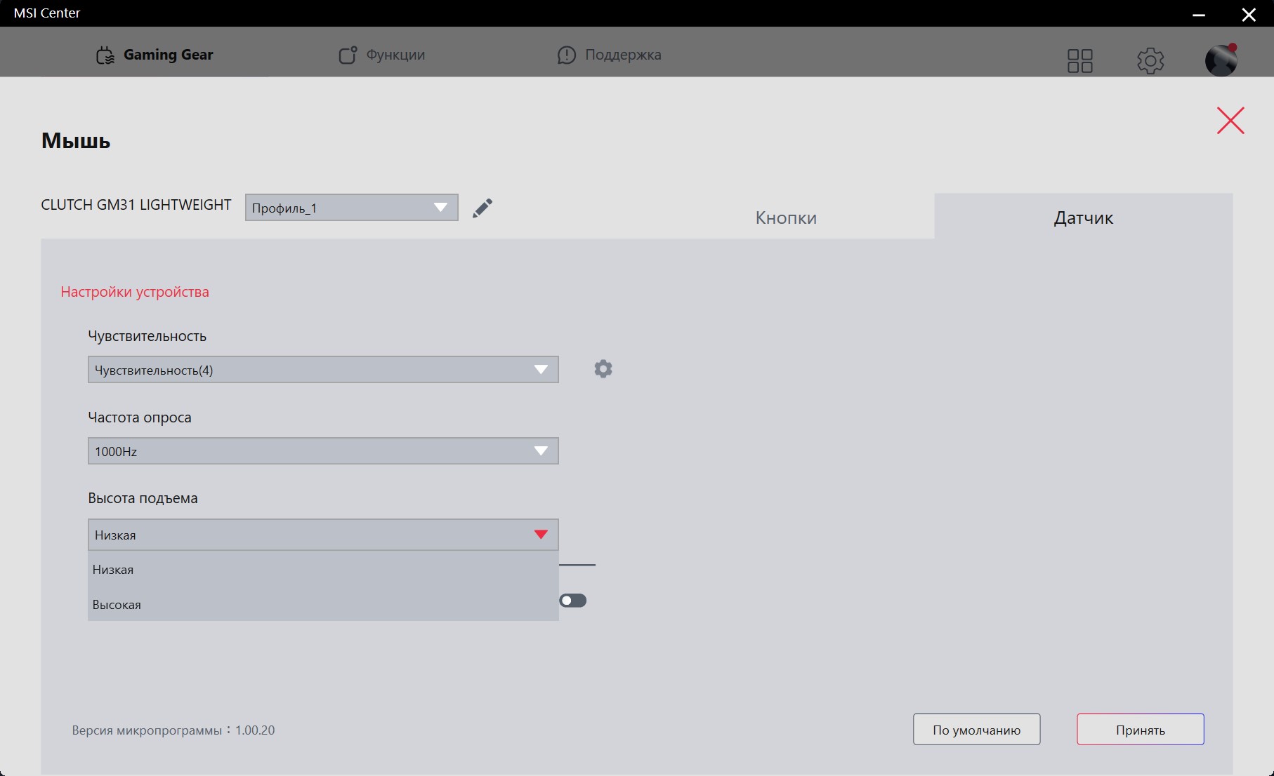 Główne ustawienia całkowicie pokrywają się z wersją bezprzewodową. DPI przełącza się za pomocą odpowiedniego przycisku na spodzie myszy. Standardowe presety: 400/800/1600/3200/6400. Ustawienia podświetlenia bez oprogramowania: