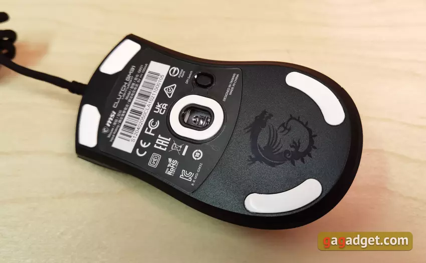 Dolna część jest nieco inna niż w wersji Wireless. Na stykach nie ma przełącznika do ładowania, co jest dość logiczne. Na obwodzie znajdują się cztery teflonowe ślizgi, otwór na czujnik również posiada teflonową ramkę. Z boku znajduje się przycisk do przełączania DPI.