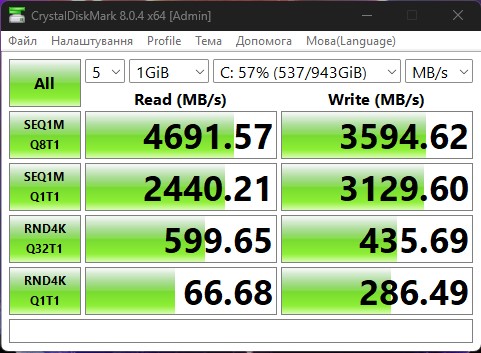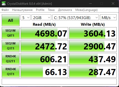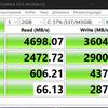 W testach dysk wykazuje deklarowane prędkości: około 4700 MB/s przy odczycie i 3600 MB/s przy zapisie.