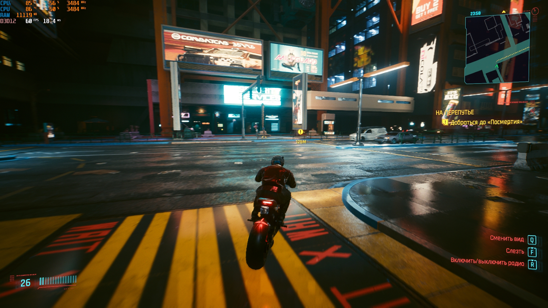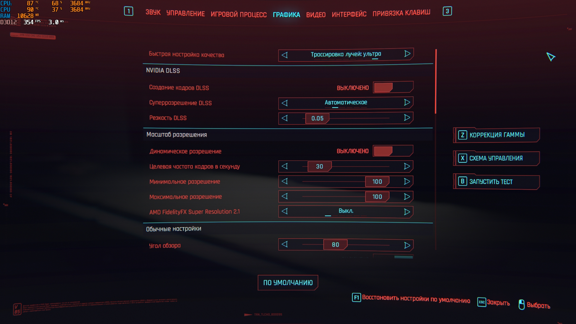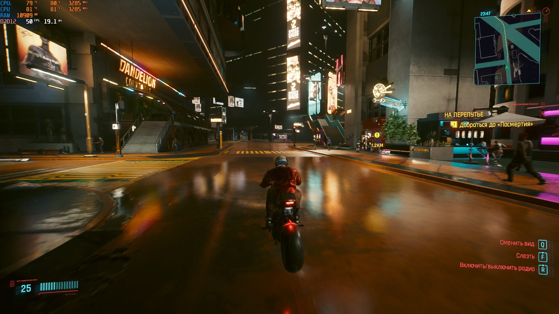 - Cyberpunk 2077. Ustawienia maksymalne, w tym ray tracing. DLSS w trybie automatycznym: 47-63 FPS.