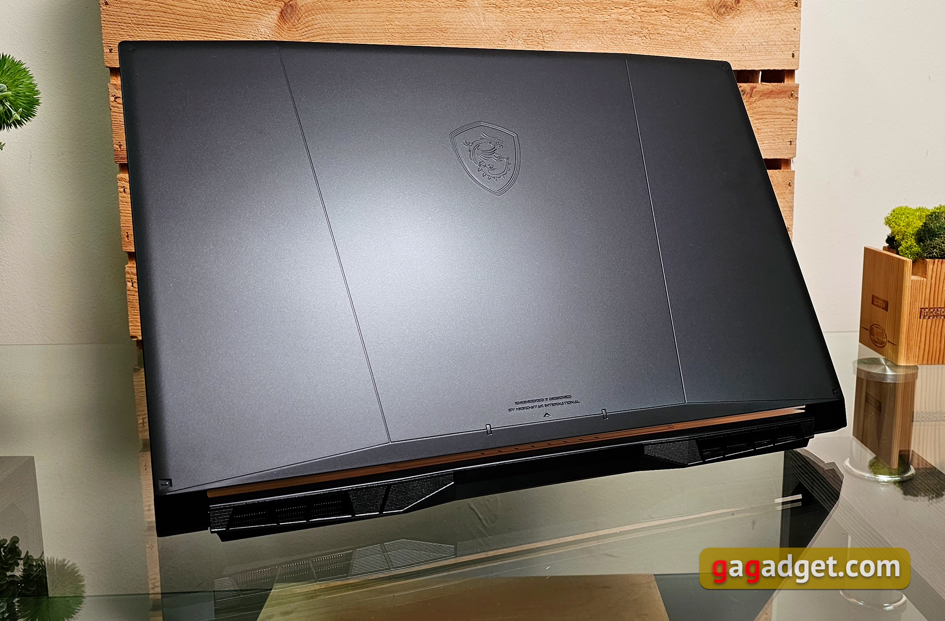 MSI Katana 17 B12V wygląda dość powściągliwie jak na model gamingowy. Wykonana jest w całości z matowego, czarnego plastiku, a jedynie klawiatura posiada podświetlenie RGB. Jak na 17-calowy model gamingowy, laptop okazał się dość cienki: 25,2 mm. Zastosowanie plastiku sprawiło, że nie jest też ciężki: 2,6 kg. Ponownie, biorąc pod uwagę przekątną wyświetlacza i potężne komponenty. Powierzchnia robocza jest przyjemna w dotyku i prawie się nie ugina. Ale ślady pracy i wydruków pozostają na niej dość aktywnie. Materiał górnej pokrywy wygląda podobnie. Wydaje się jednak, że zastosowano nieco inną powłokę: prawie nie pozostawia ona odcisków. Pokrywa jest ozdobiona logo MSI i kilkoma liniami.