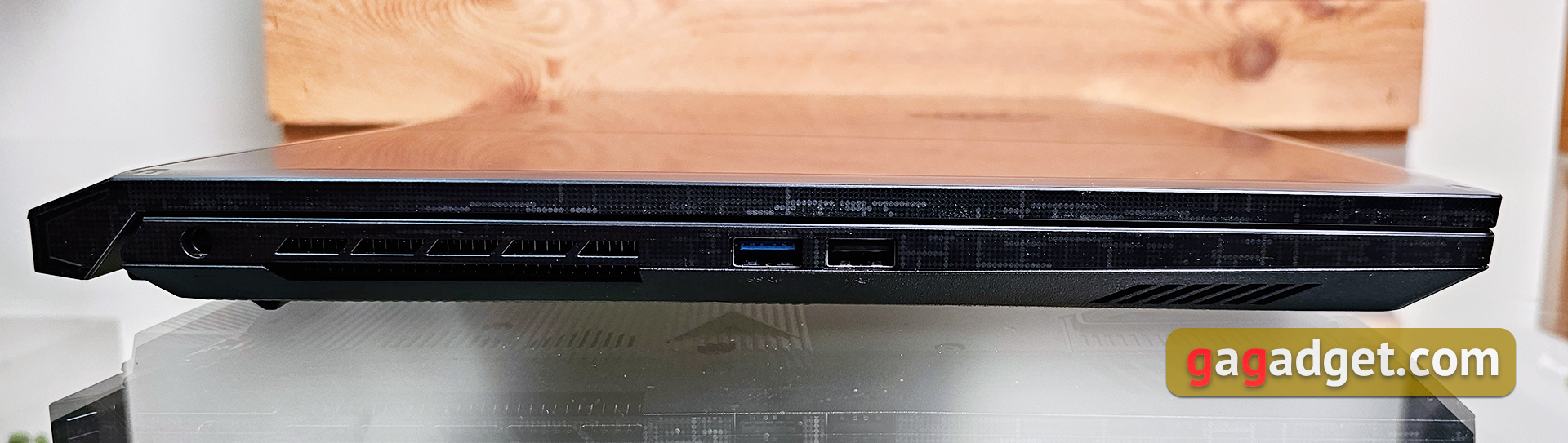 Elementy dekoracyjne obejmują geometryczny wzór małych kropek wokół obwodu obudowy. Firma nazywa go Digital Bricks Texture. Po lewej stronie laptopa znajdują się otwory wentylacyjne, gniazdo zasilania oraz pełnowymiarowe porty USB 3.2 Gen1 i USB 2.0: