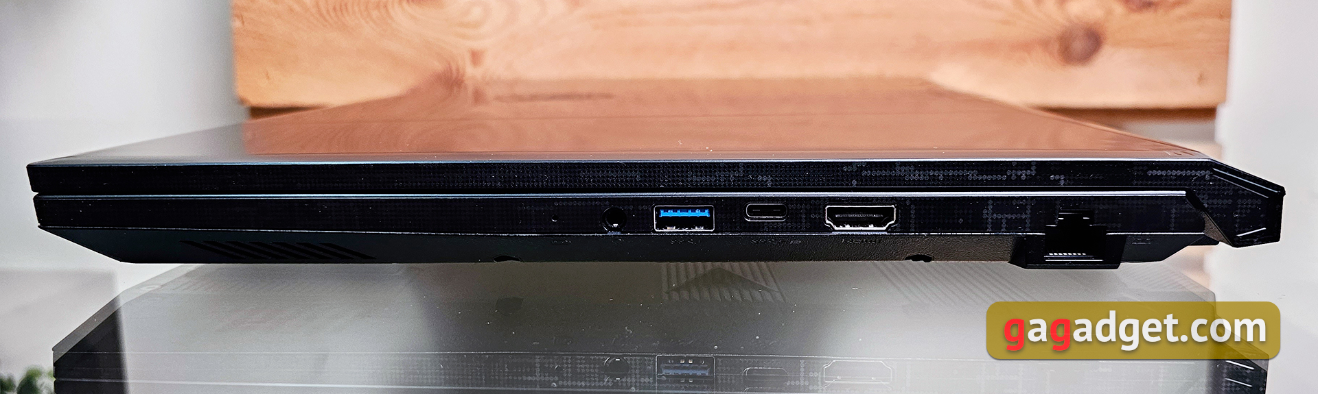 Poprawej stronie znajduje się połączone gniazdo audio 3,5 mm do podłączenia zestawu słuchawkowego, pełnowymiarowe porty USB 3.2 Gen1, USB 3.2 Gen1 Type-C (z obsługą DisplayPort), HDMI 2.1 i RJ-45. Nie ma żadnych otworów wentylacyjnych, więc gorące powietrze nie będzie dmuchać na dłoń i mysz.