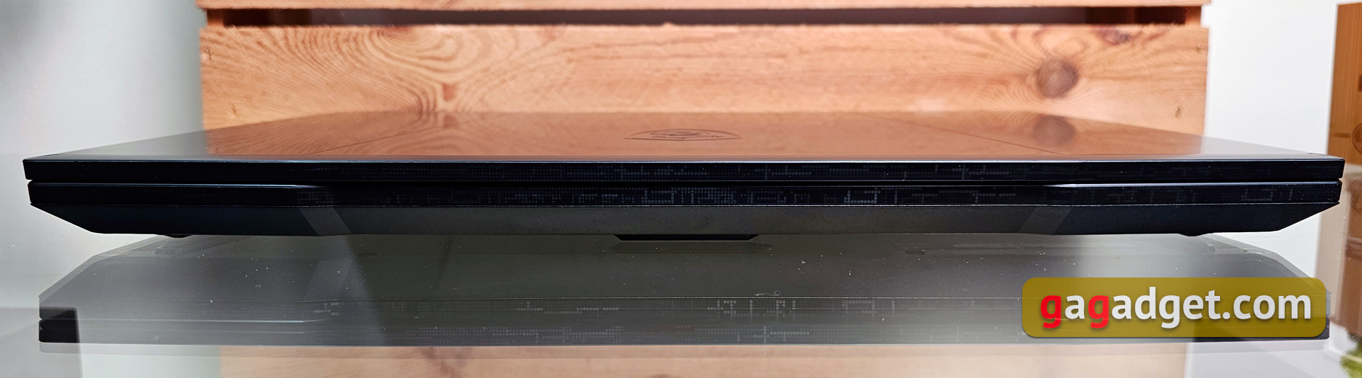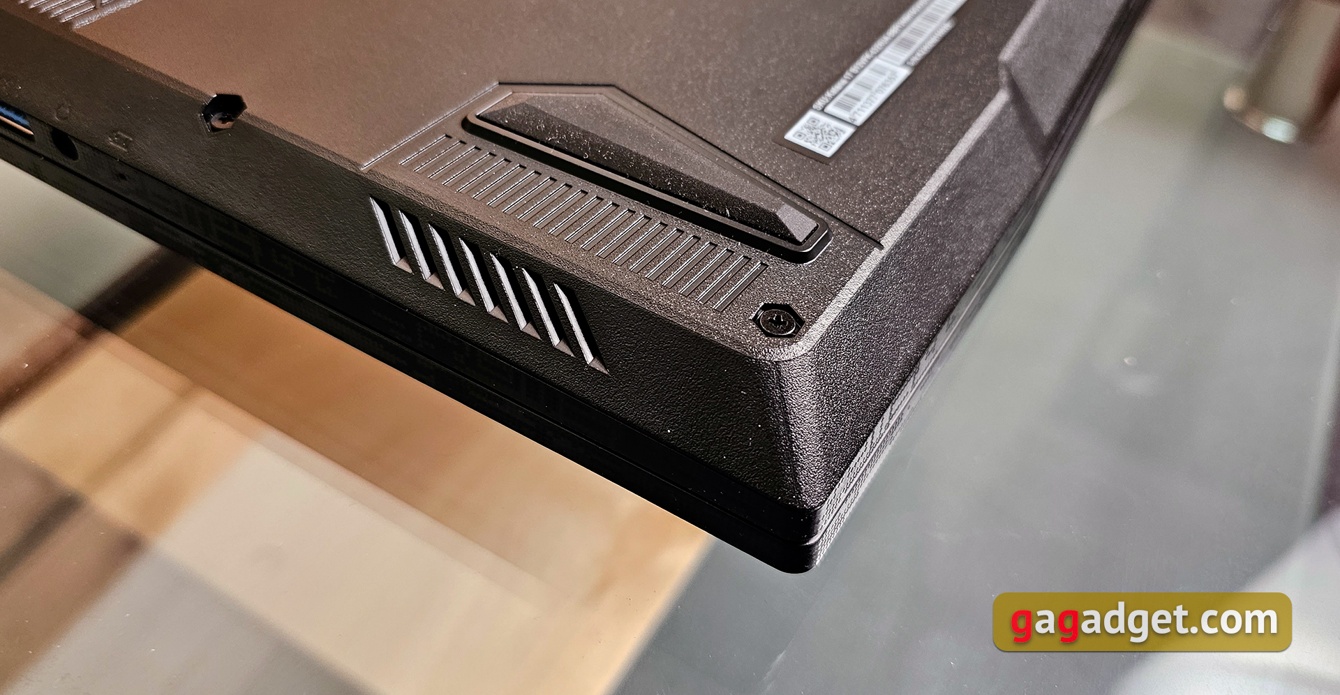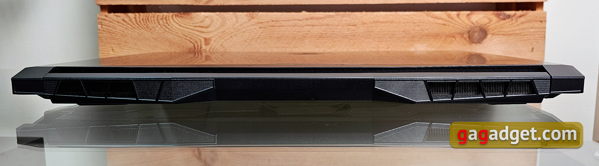 Przednia krawędź laptopa nie posiada żadnych funkcjonalnych elementów. Tył ma dwie strefy do wydmuchiwania gorącego powietrza przez układ chłodzenia i zawiasy.