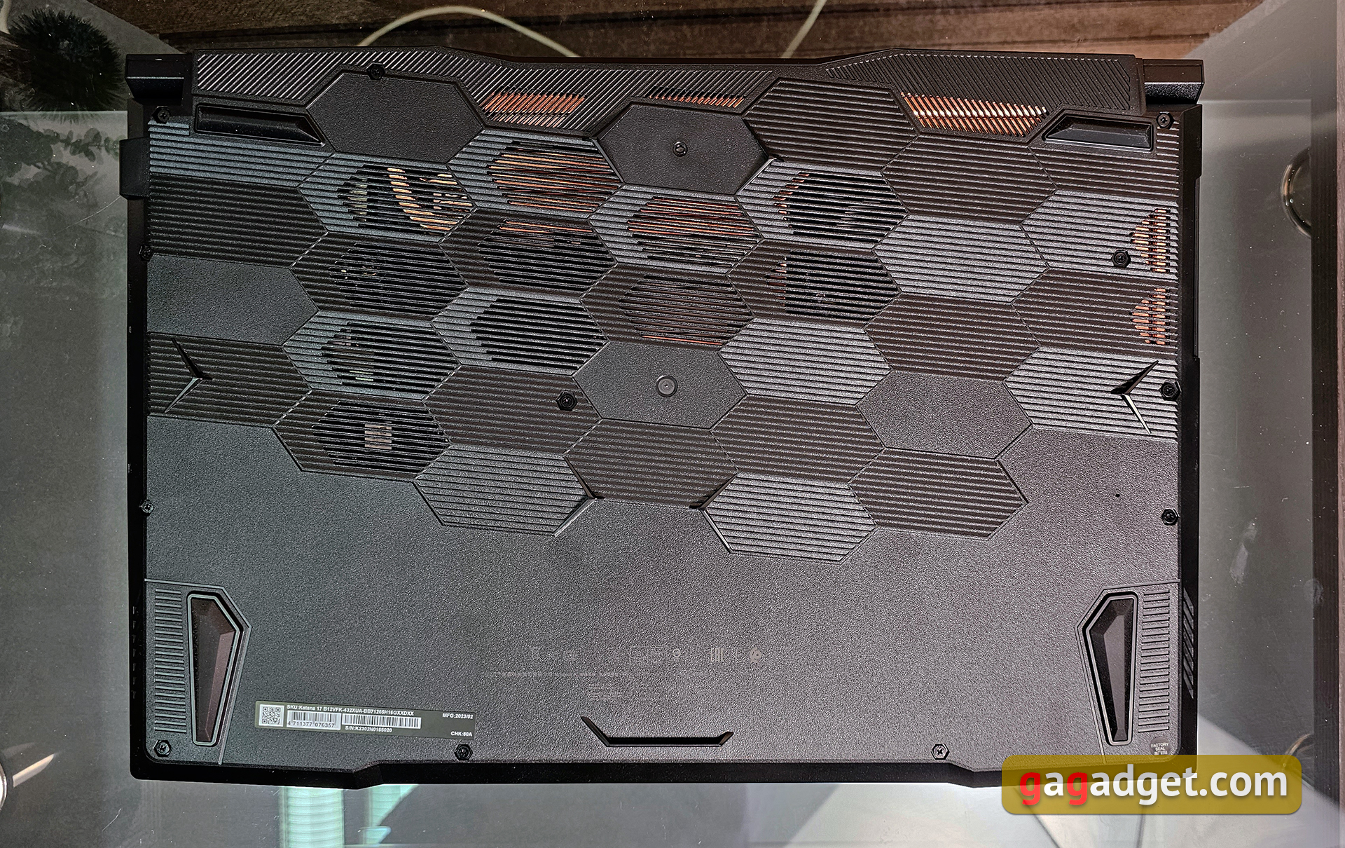 Spód laptopa wykonany jest z innego, chropowatego plastiku. Na spodzie znajdują się masywne gumowe nóżki i wiele otworów wentylacyjnych w kształcie plastra miodu. Pod nimi widoczne są miedziane rurki cieplne układu chłodzenia. Laptop ma możliwość aktualizacji, ale informacje na oficjalnej stronie (i obecność plomby) sugerują, że należy to zrobić w oficjalnym centrum serwisowym. Po zdjęciu pokrywy uzyskujemy jednak dostęp do dwóch slotów SO-DIMM (obsługiwane jest do 64 GB pamięci RAM), karty sieci bezprzewodowej oraz dysku SSD. Laptop posiada dwa złącza M.2 dla dysków.