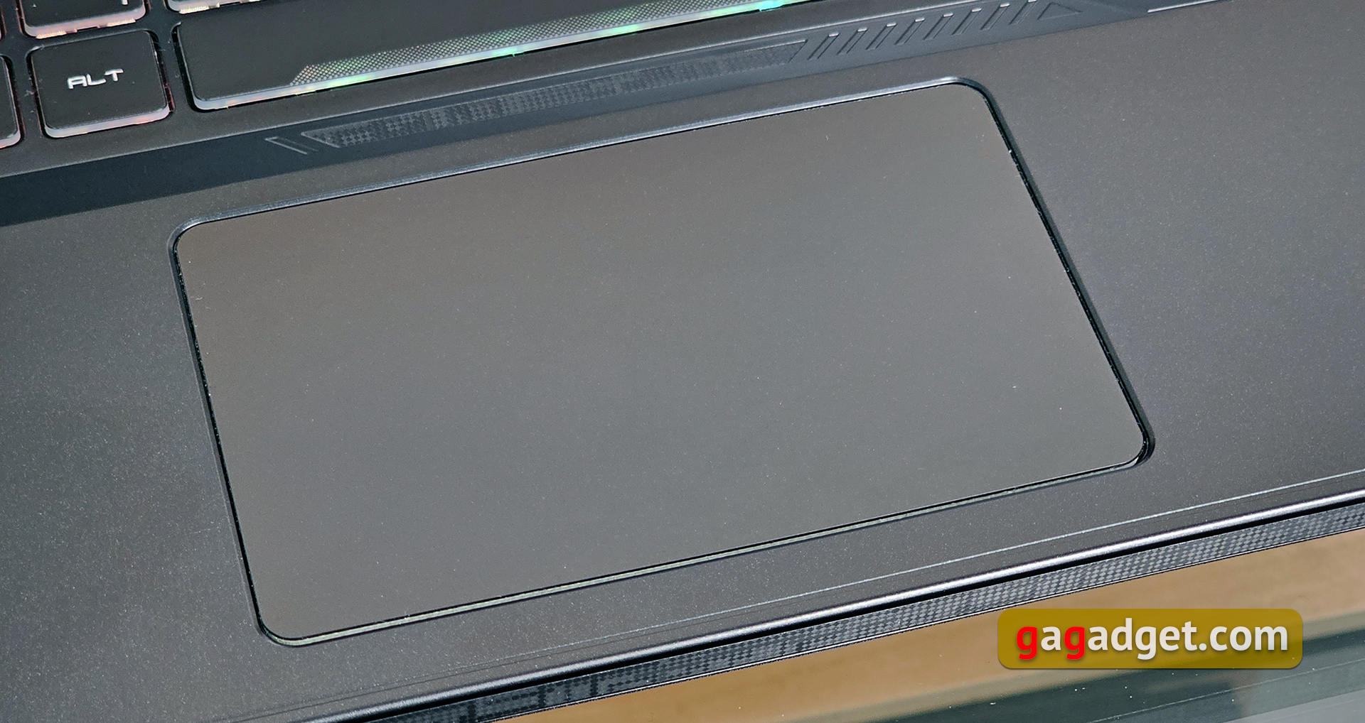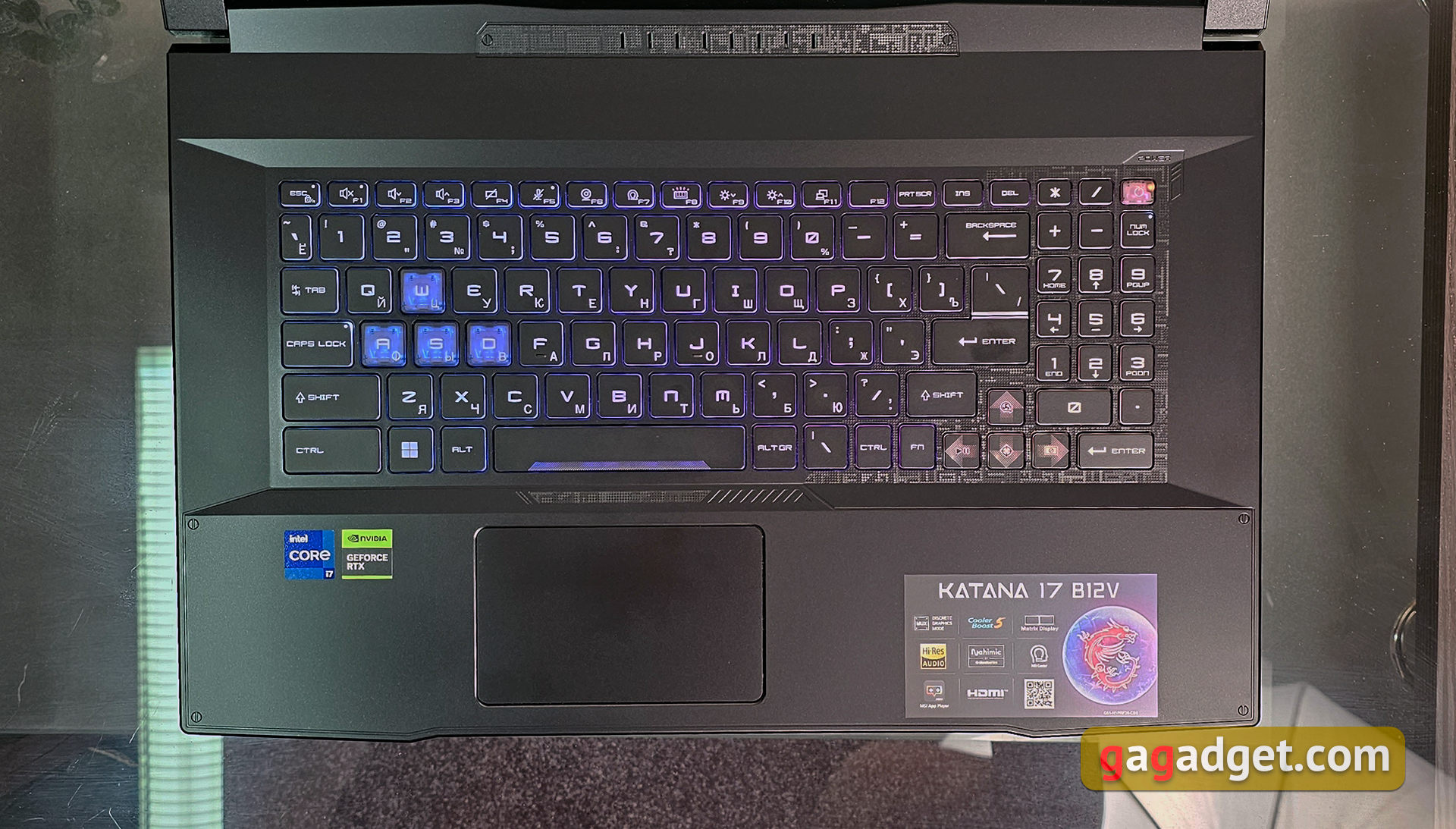 MSI Katana 17 B12V ma pełnowymiarową klawiaturę z dodatkowym blokiem numerycznym, ale z kilkoma nietypowymi funkcjami. Biorąc pod uwagę szerokość laptopa, można go było uczynić nieco szerszym i bardziej znanym. Górny rząd ma zwykle zmniejszoną wysokość i kończy się przezroczystym przyciskiem zasilania z wbudowaną diodą LED. Przyciski WASD są również przezroczyste. Lewe klawisze Shift i Ctrl są nieco dłuższe niż standardowo, ale to sprawiło, że zrezygnowaliśmy z przycisku Fn. Znajduje się on tylko po prawej stronie głównego bloku, co nie jest zbyt wygodne podczas korzystania z klawiszy funkcyjnych. Enter to jednopoziomowy długi klawisz. Blok nawigacyjny nie jest oddzielony od głównego bloku i ma przyciski o standardowym rozmiarze, co sprawiło, że prawy przycisk Shift jest nieco mniejszy. Klawiatura numeryczna matrzy, a nie cztery kolumny. Dodatkowy Enter znajduje się pod blokiem, a "+" i "-" nad nim, obok NumLock. Ogólnie rzecz biorąc, nie ma nic krytycznego, a dodatkowa klawiatura numeryczna może być przydatna podczas pracy. Przyzwyczajenie się do niego zajmuje jednak trochę czasu.