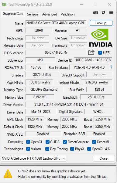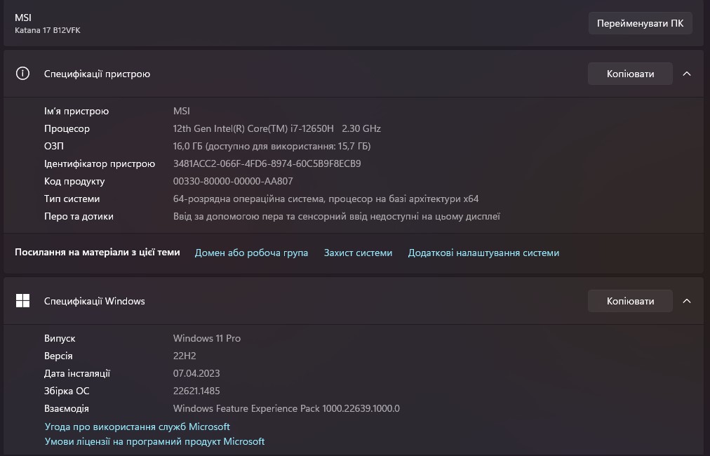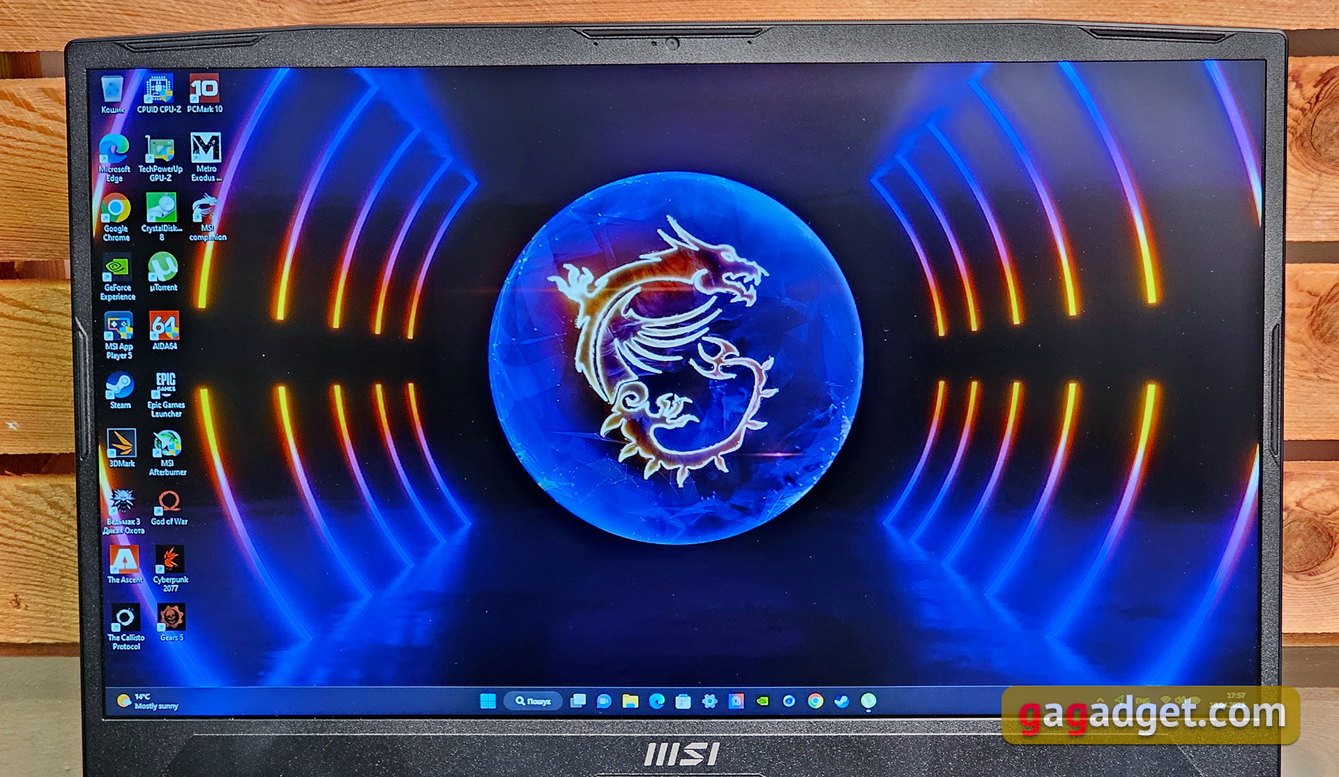 Wewnątrz naszej konfiguracji MSI Katana 17 B12V znajduje się procesor Intel 12. generacji. Mianowicie, Intel Core i7-12650H Alder Lake. Jest on produkowany przy użyciu procesu Intel 7 i zawiera 10 rdzeni. Jest 6 wydajnych i 4 energooszczędne rdzenie, a obsługiwanych jest do 16 wątków. Bazowa częstotliwość taktowania wynosi 2,3 GHz, maksymalna częstotliwość do 4,7 GHz, pamięć podręczna trzeciego poziomu to 24 MB, a TDP wynosi 45 W. Wbudowany akcelerator graficzny Intel UHD o bazowej częstotliwości 350 MHz i maksymalnej częstotliwości 1,40 GHz zapewnia niewymagające zadania i żywotność baterii. Dyskretna karta graficzna to NVIDIA GeForce RTX 4060 Laptop z 8 GB pamięci wideo GDDR6. W naszym przypadku poziom TGP może osiągnąć 105 W z Dynamic Boost. Częstotliwość bazowa wynosi 1920 MHz, z podbiciem do 2250 MHz. Laptop jest wyposażony w multiplekser MUX Switch do bezpośredniego podłączenia karty graficznej do wyświetlacza, z pominięciem wbudowanego układu graficznego. W tym trybie wbudowana grafika jest wyłączona, co zwiększa wydajność i zmniejsza opóźnienia. Przełączanie odbywa się w aplikacji MSI Centre (GPU Switch) i wymaga restartu systemu. Ilość pamięciRAM w naszej konfiguracji to 16 GB DDR5-4800, z dostępem do obu slotów, a obsługiwane jest do 64 GB. Możliwości łączności: 802.11ax Wi-Fi 6, Bluetooth v5.2 i Gigabit Ethernet.