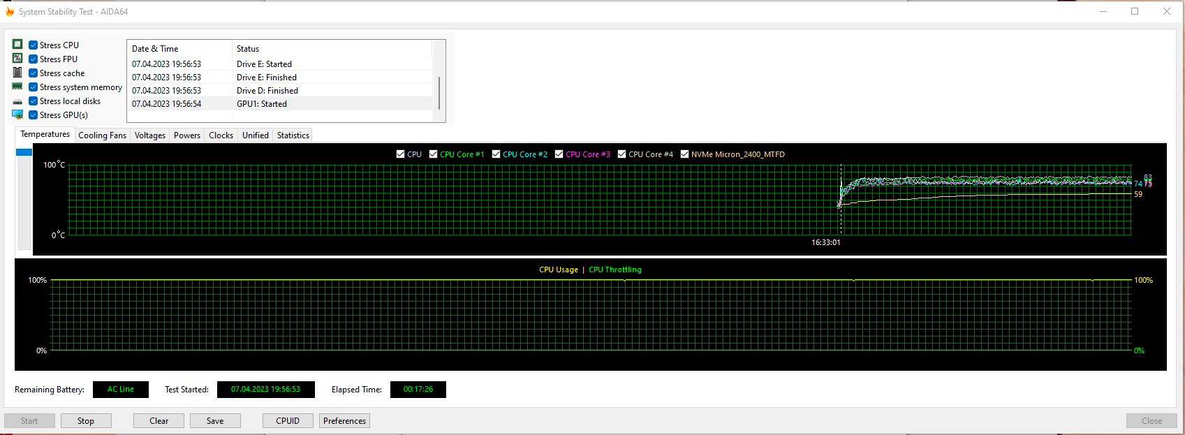 W teście obciążeniowym AIDA64 temperatura komponentów wewnętrznych nie przekroczyła 85°. W związku z tym system działa stabilnie i nie zaobserwowano kłusowania.