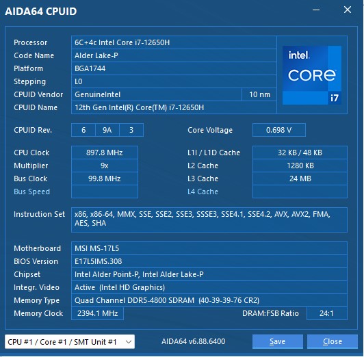 | Procesor. | Intel Core i7-12650H (2,3-4,7 GHz), 10 rdzeni (6P+4E), 16 wątków, (Alder Lake, Intel 7) |