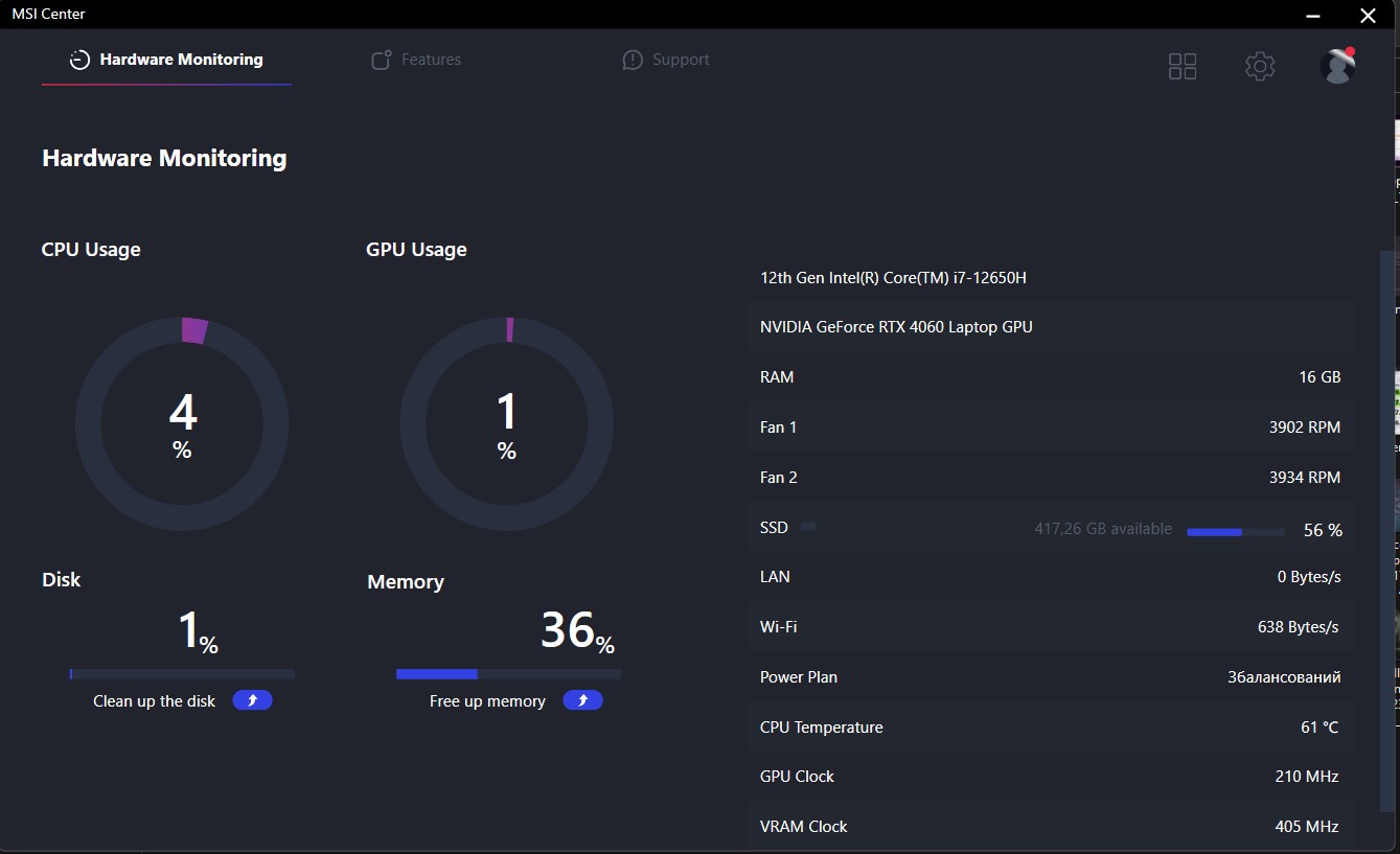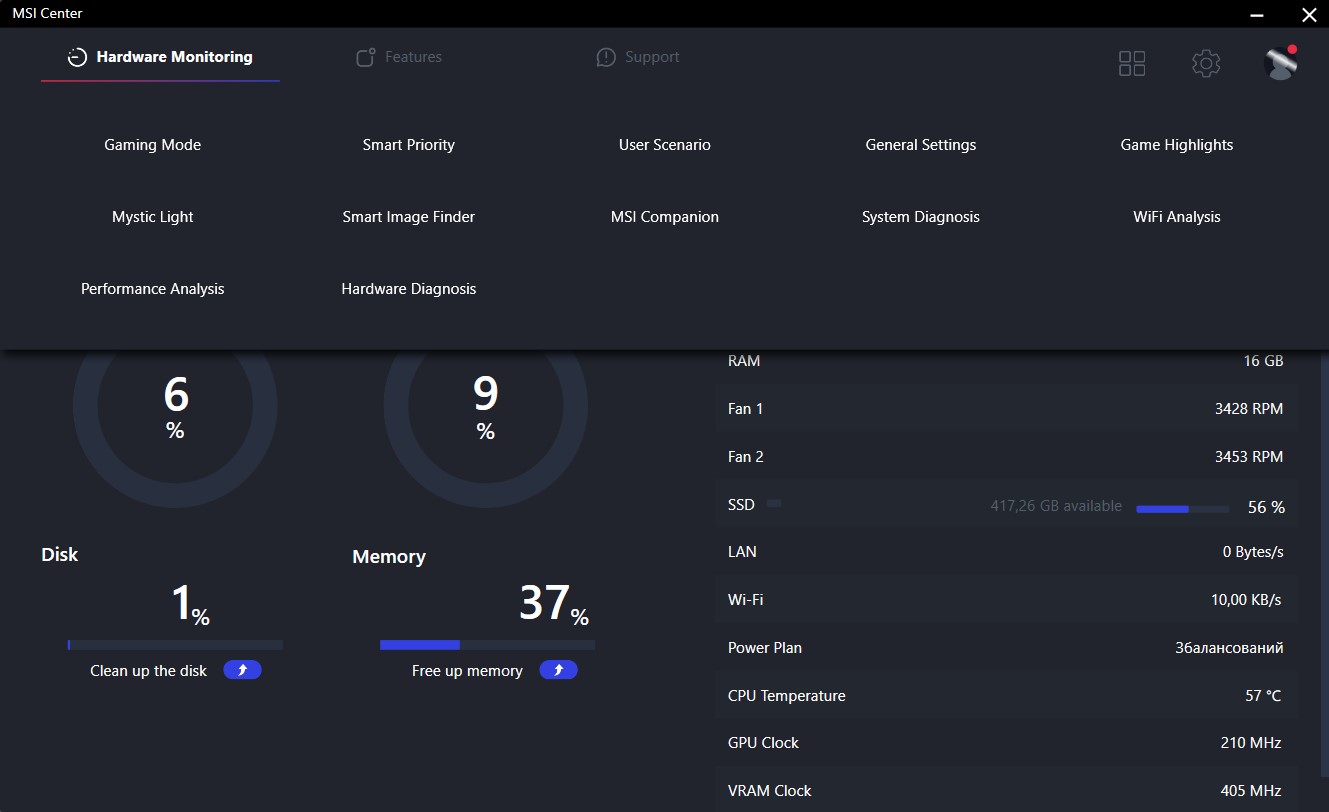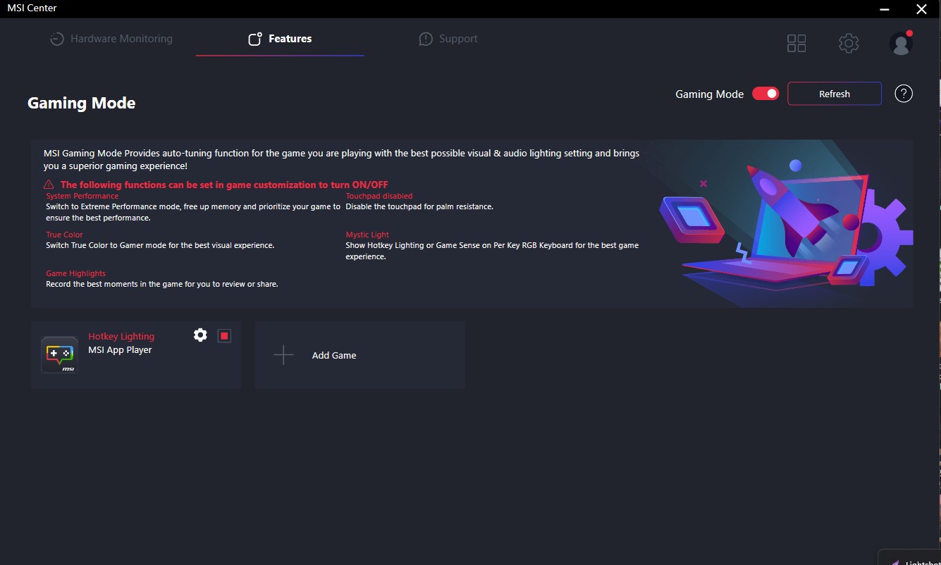 Prawie wszystkie ustawienia laptopa zebrane są w aplikacji MSI Center. Obejmują one przełączanie trybów karty graficznej (MUX Switch), scenariusze wydajności, monitorowanie i diagnostykę systemu, ustawienia podświetlenia i wiele innych. Wśród ciekawych funkcji dodatkowych znajduje się MSI App Player. W rzeczywistości jest to emulator do grania w gry na Androida z ulepszoną wydajnością, obsługą gamepada i trybem konsoli.
