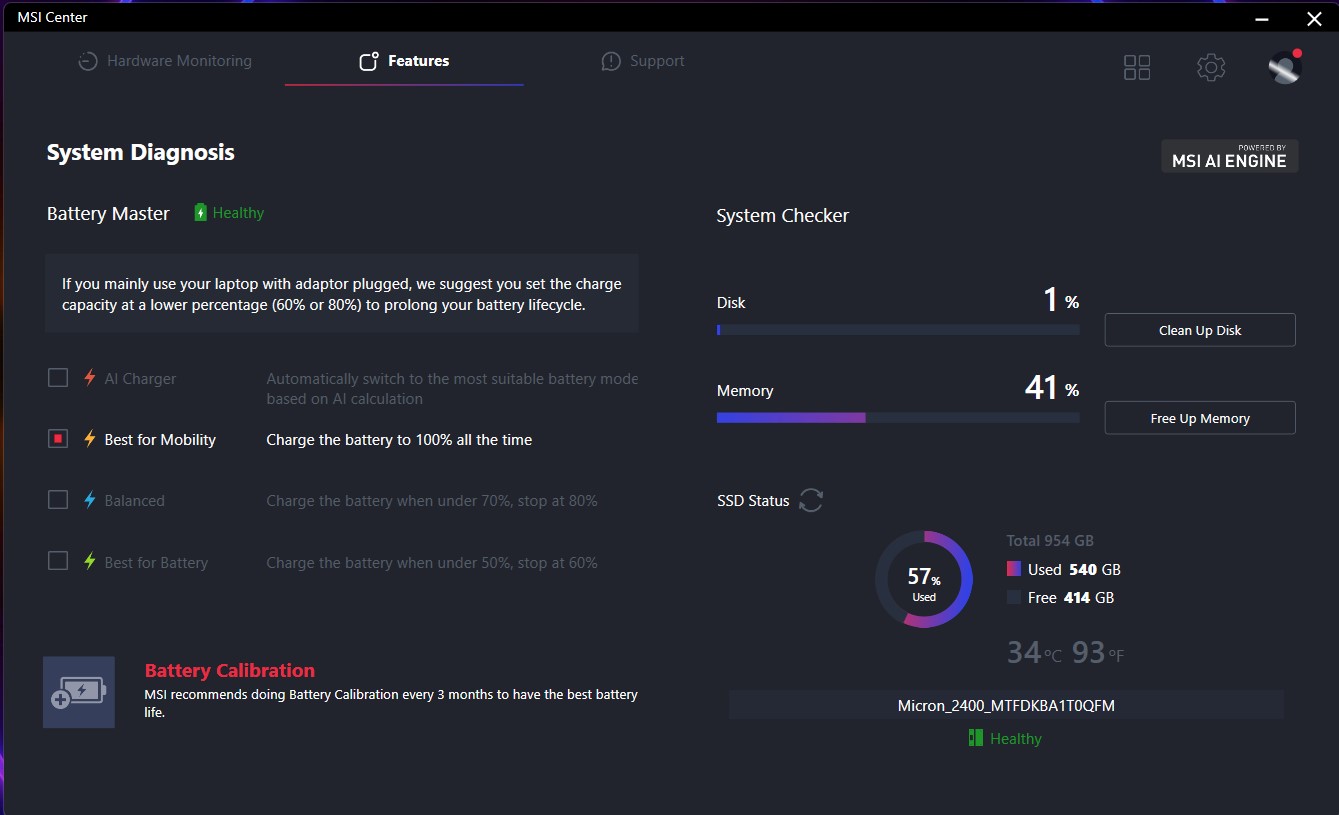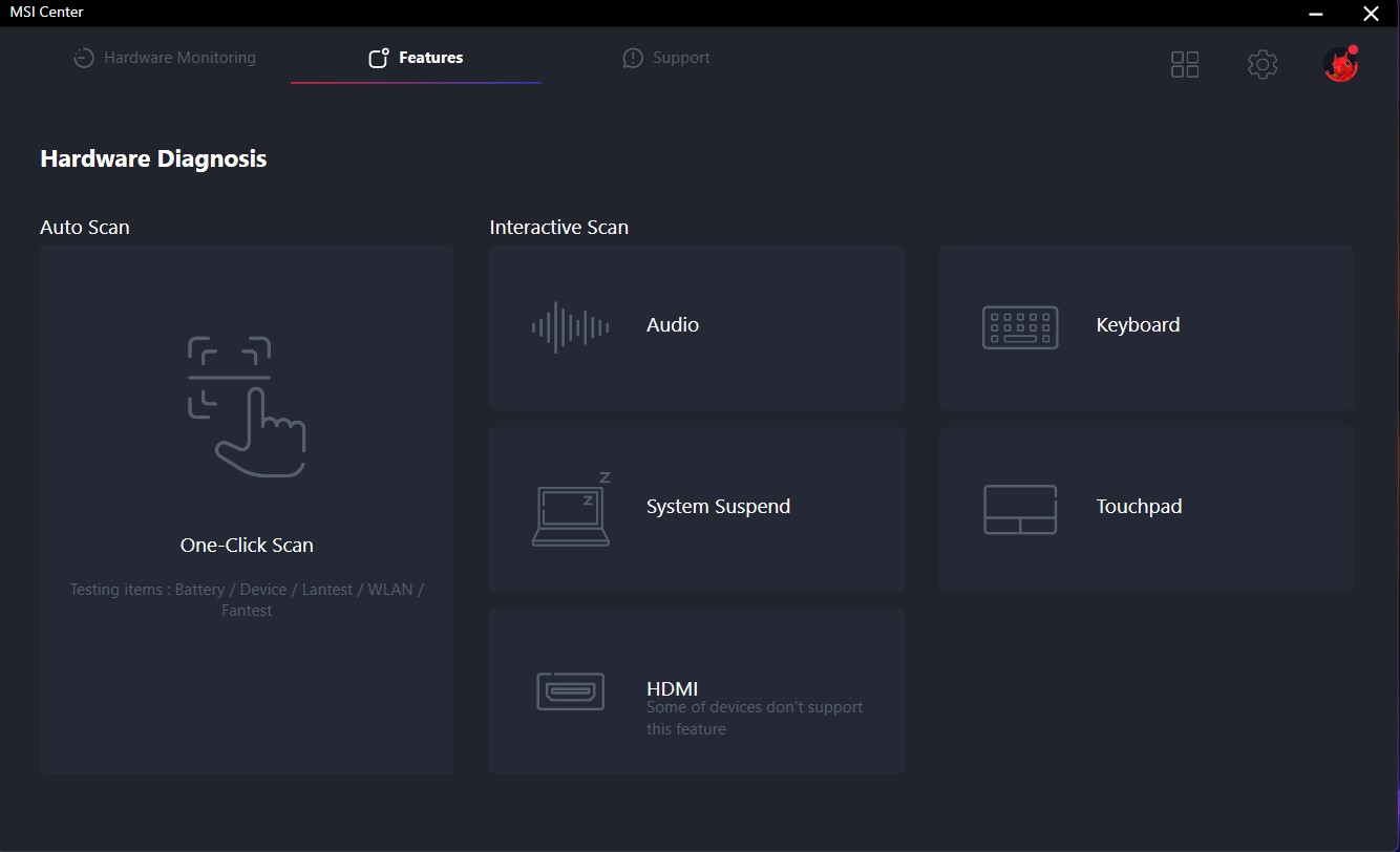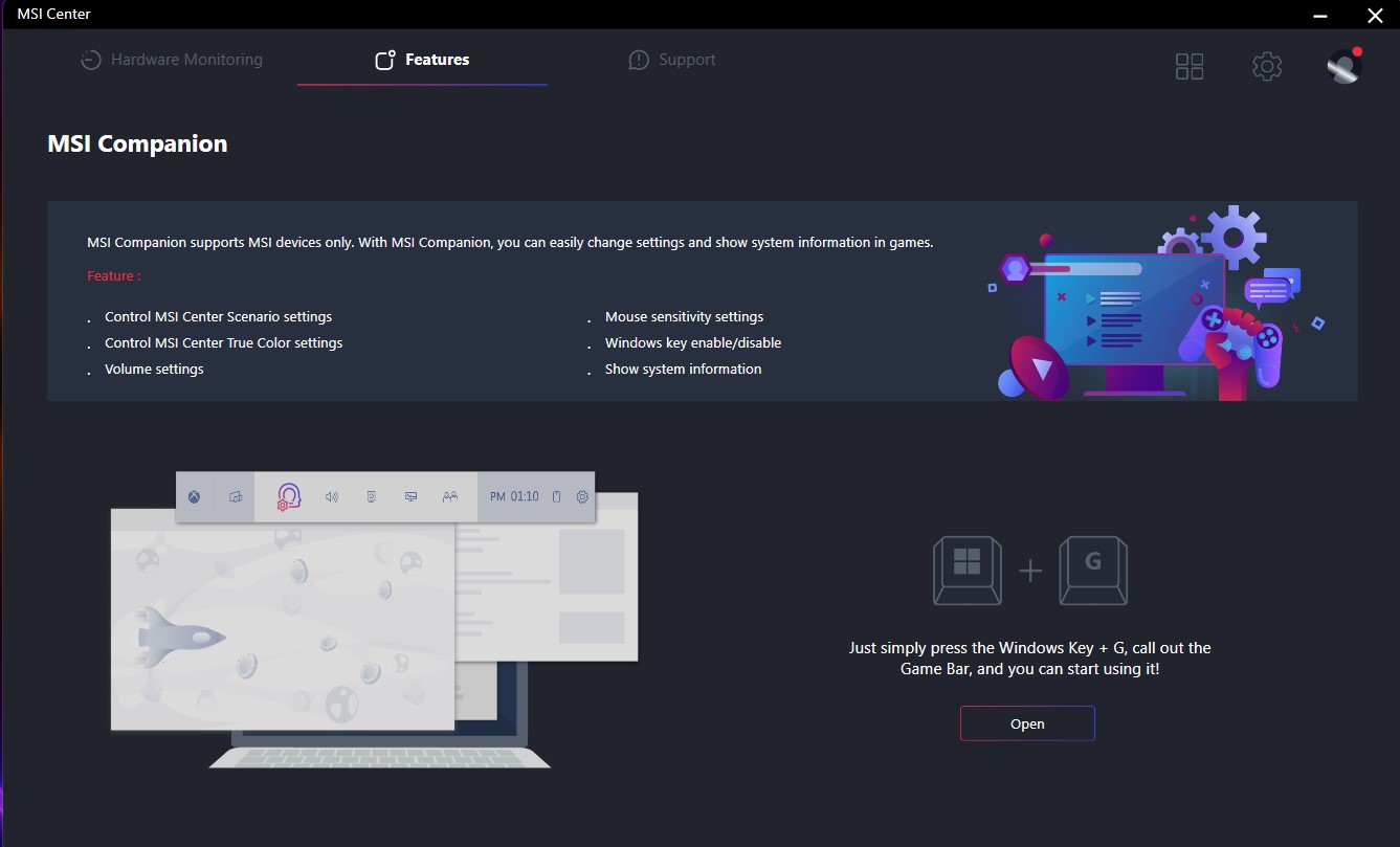 Prawie wszystkie ustawienia laptopa zebrane są w aplikacji MSI Center. Obejmują one przełączanie trybów karty graficznej (MUX Switch), scenariusze wydajności, monitorowanie i diagnostykę systemu, ustawienia podświetlenia i wiele innych. Wśród ciekawych funkcji dodatkowych znajduje się MSI App Player. W rzeczywistości jest to emulator do grania w gry na Androida z ulepszoną wydajnością, obsługą gamepada i trybem konsoli.
