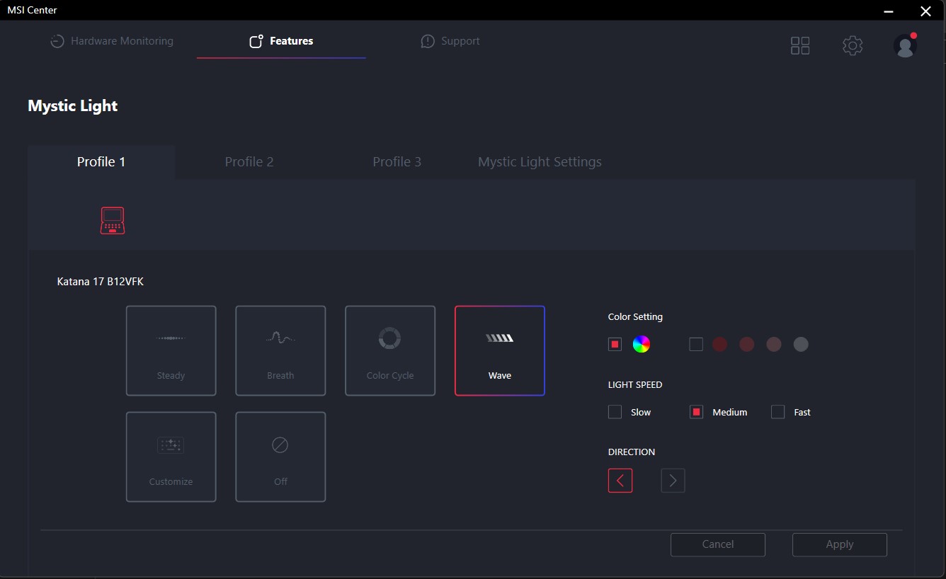 Przyciski mają pełny skok 1,7 mm. Działają bardzo przyjemnie, skok jest elastyczny, miękki i treściwy. Dostępne jest podświetlenie RGB z kilkoma poziomami jasności i czterema strefami, które można regulować w aplikacji MSI Center.