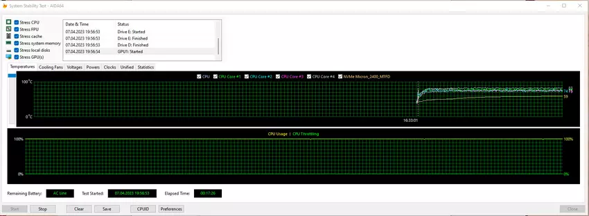 W teście obciążeniowym AIDA64 temperatura komponentów wewnętrznych nie przekroczyła 85°. W związku z tym system działa stabilnie i nie zaobserwowano kłusowania.