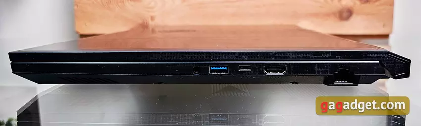 Elementy dekoracyjne obejmują geometryczny wzór małych kropek wokół obwodu obudowy. Firma nazywa go Digital Bricks Texture. Po lewej stronie laptopa znajdują się otwory wentylacyjne, gniazdo zasilania oraz pełnowymiarowe porty USB 3.2 Gen1 i USB 2.0: