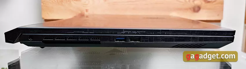 Przednia krawędź laptopa nie posiada żadnych funkcjonalnych elementów. Tył ma dwie strefy do wydmuchiwania gorącego powietrza przez układ chłodzenia i zawiasy.