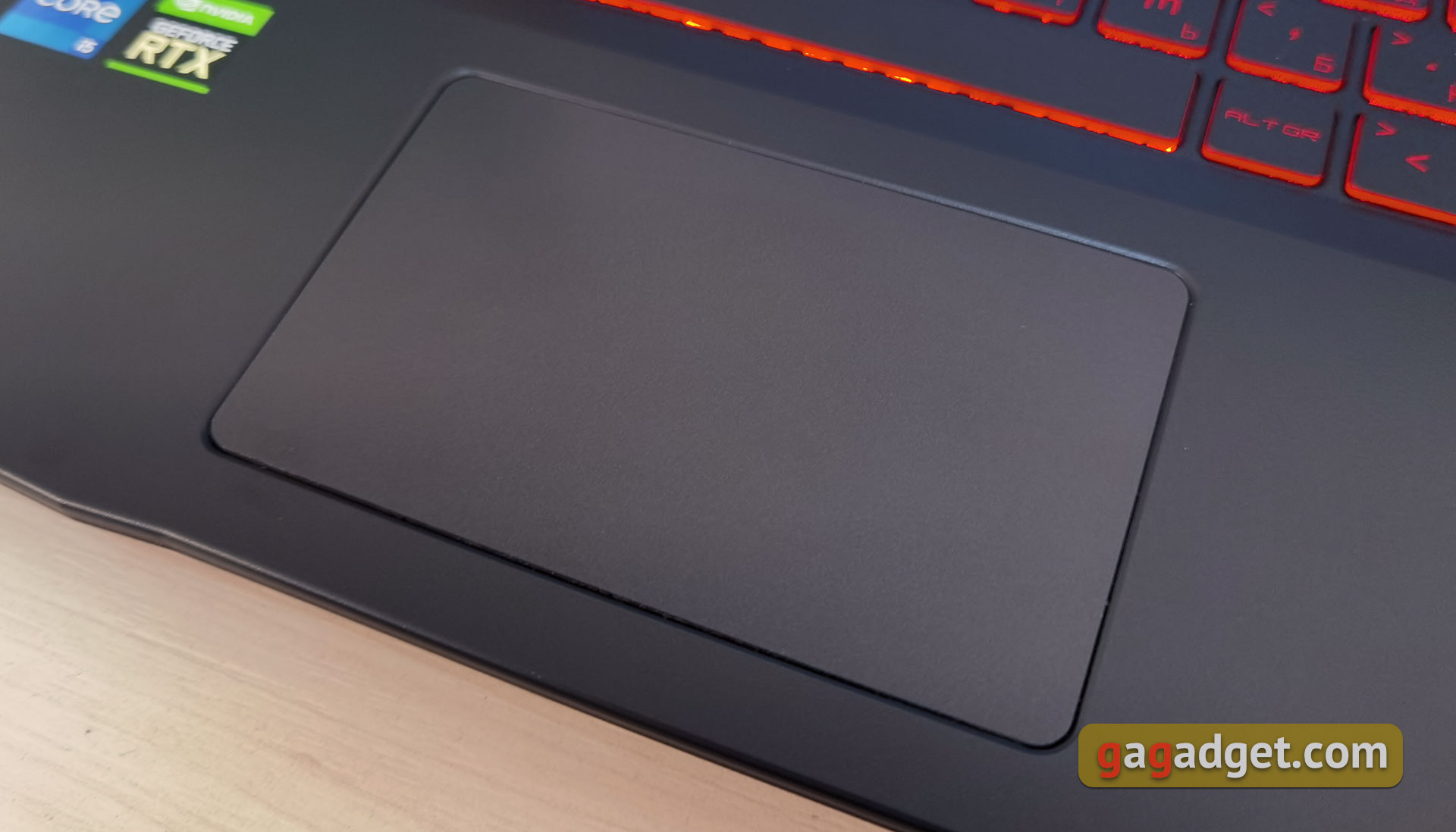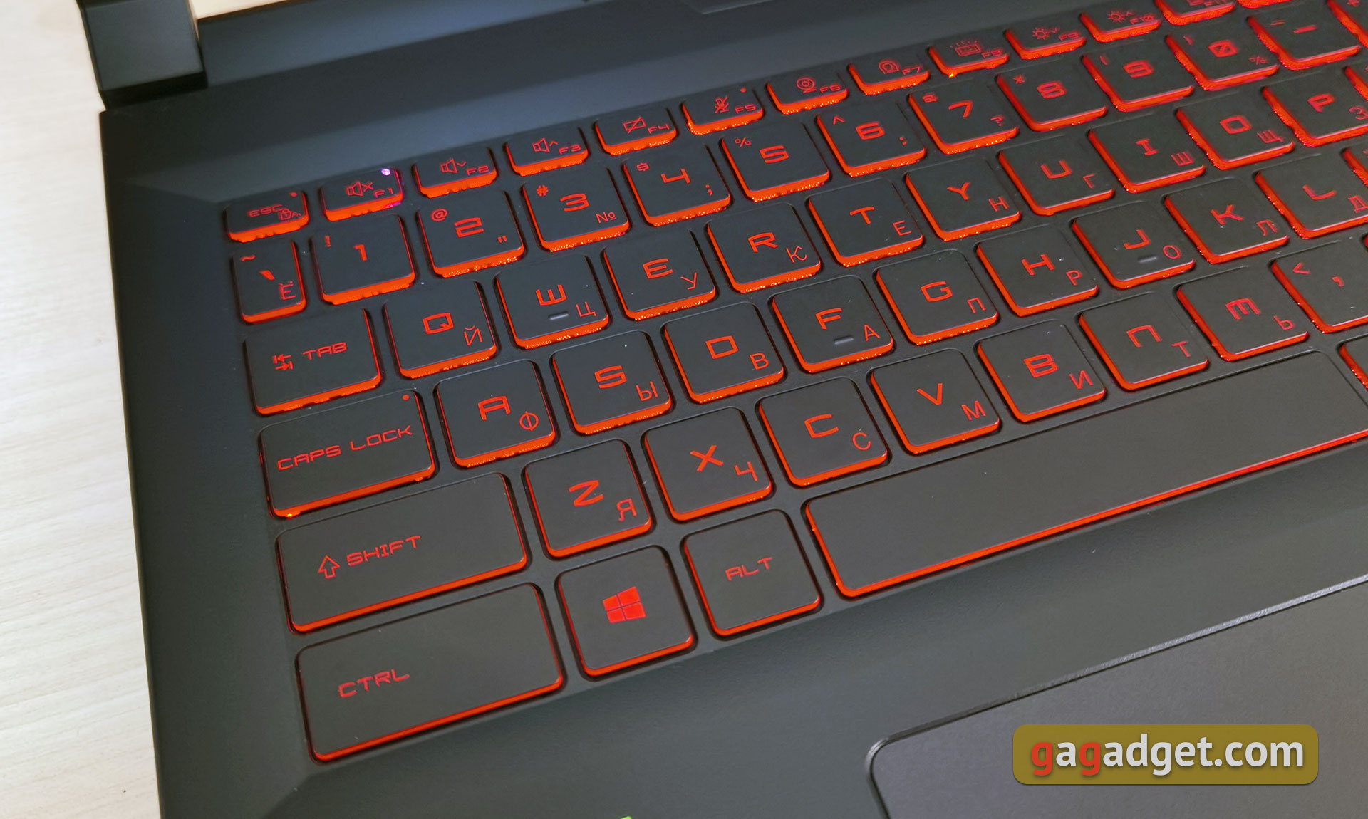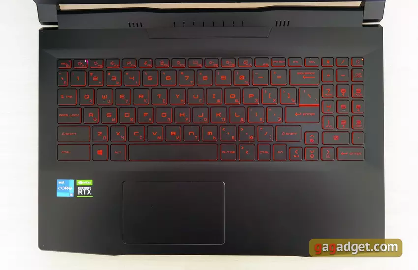 MSI Katana GF66 11UD ma pełnowymiarową klawiaturę z dodatkową klawiaturą numeryczną, co nie jest tak powszechne w modelach 15,6-calowych. Klawiatura ma swoje własne cechy, ale wszystkie najczęściej używane klawisze są na swoich miejscach, więc przyzwyczajenie się do tego nie potrwa długo. Górny rząd przycisków funkcyjnych ma nieco mniejszą wysokość. Lewy Shift i Ctrl są dłuższe niż standardowe, Enter jest jednopiętrowy. Ze względu na obecność bloku cyfrowego, konieczne było lekkie przesunięcie bloku strzałek w lewo, w wyniku czego, prawy Shift wygląda na lekko skrócony. Sam blok liczbowy ma trzy, a nie cztery kolumny. Pod blokiem umieszczono dodatkowe Enter, a nad nim „+” i „-”.