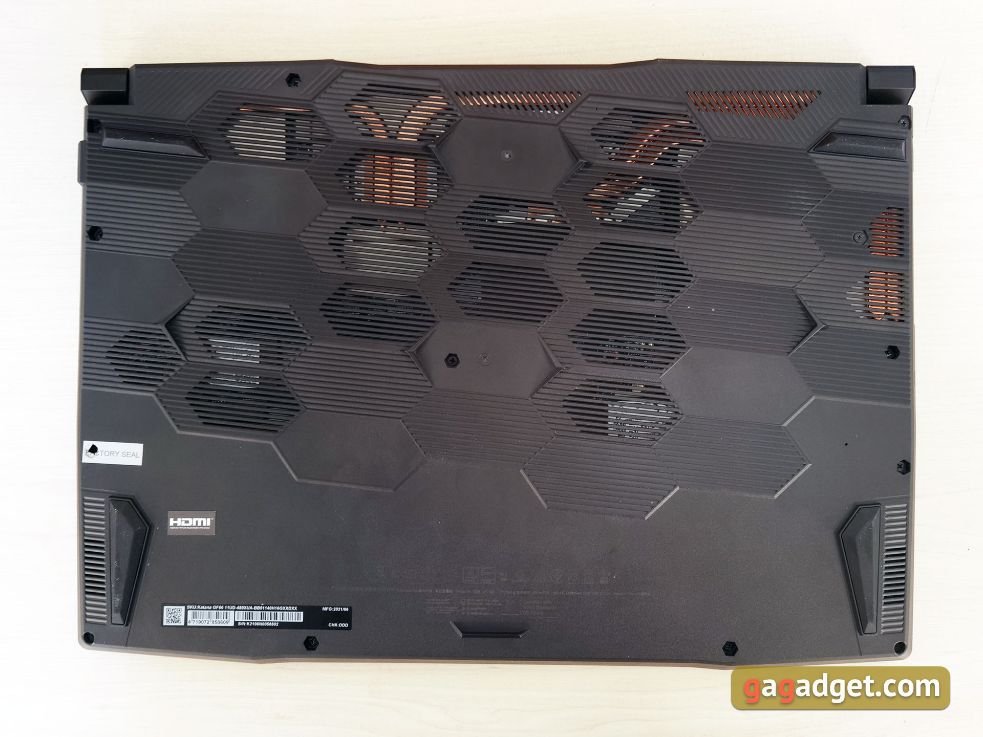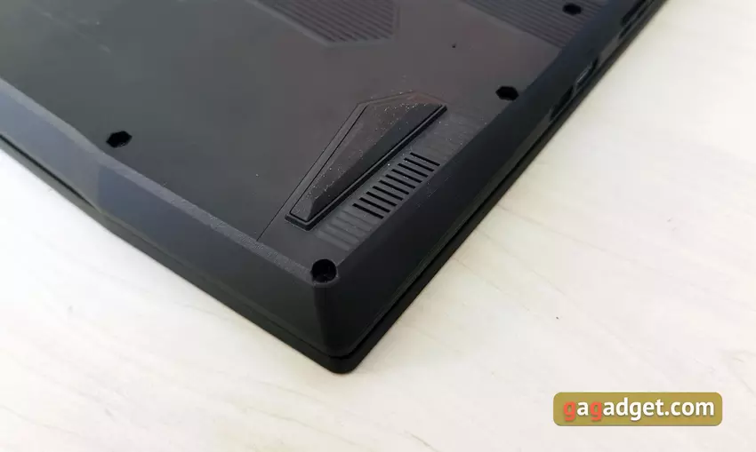 Na spodzie laptopa są głośniki stereo, cztery szerokie gumowe nóżki zapewniające stabilność oraz duża ilość otworów wentylacyjnych, przez które trafia zimne powietrze. Wykonane są w formie asymetrycznych plastrów miodu.