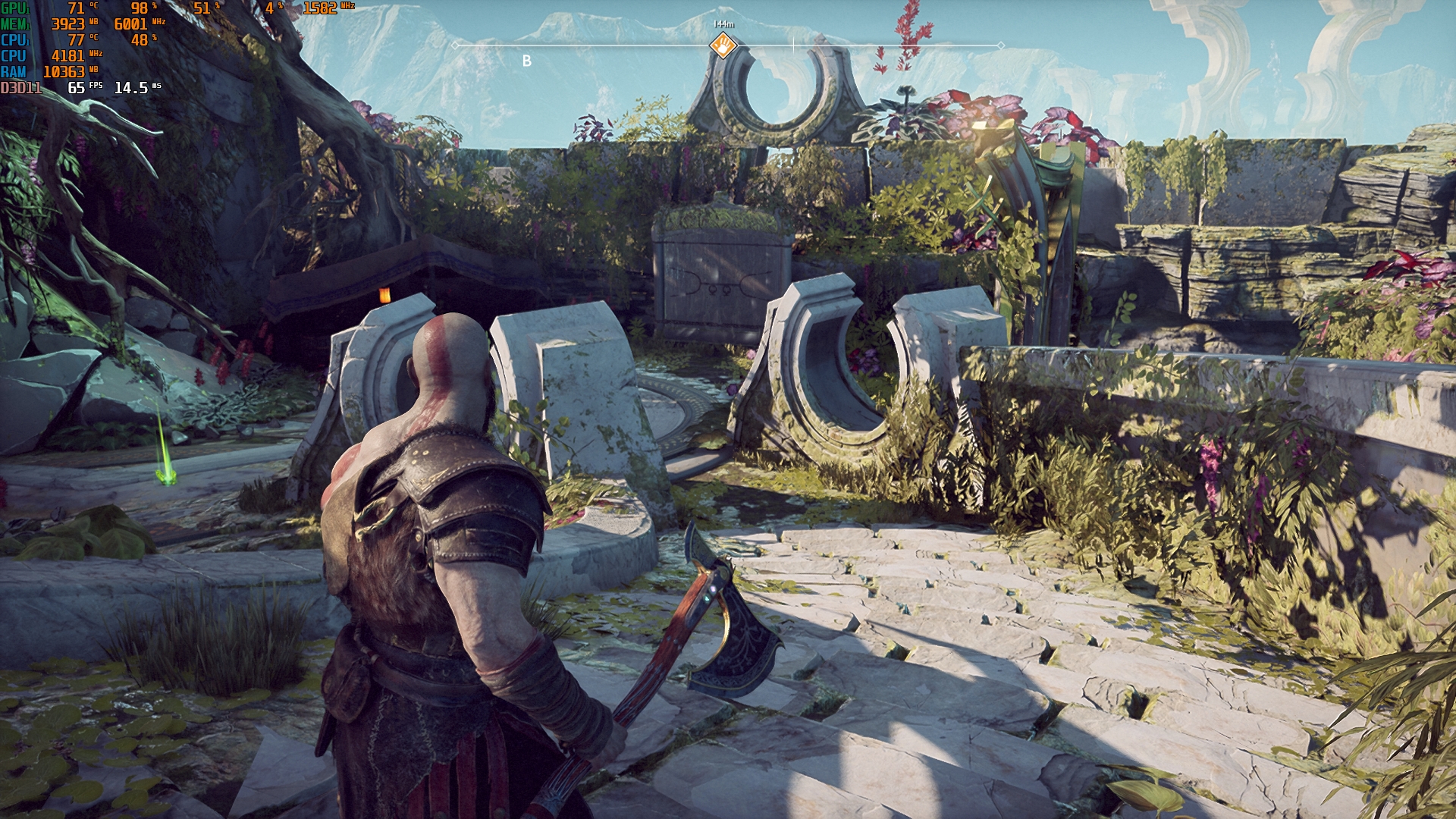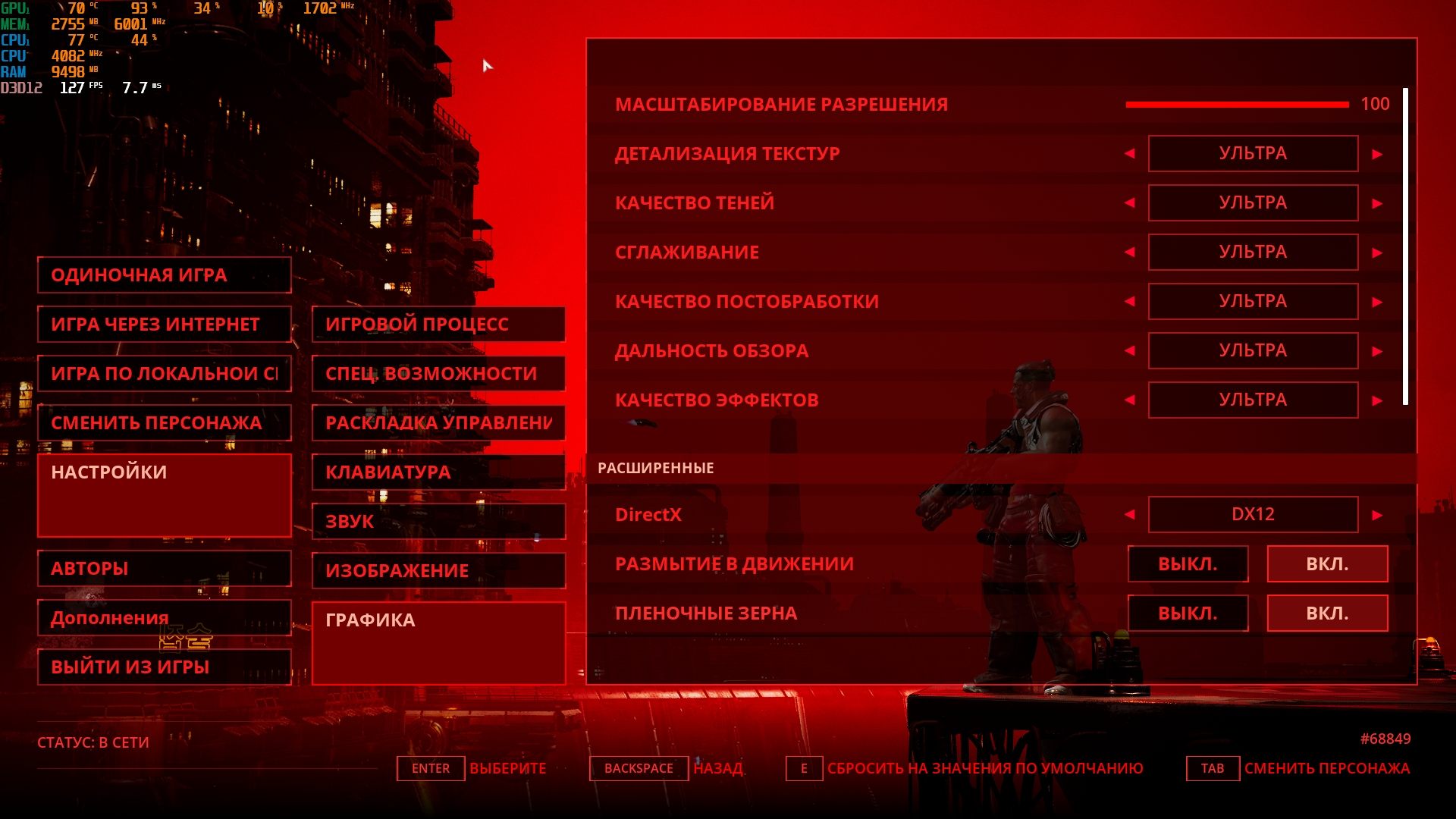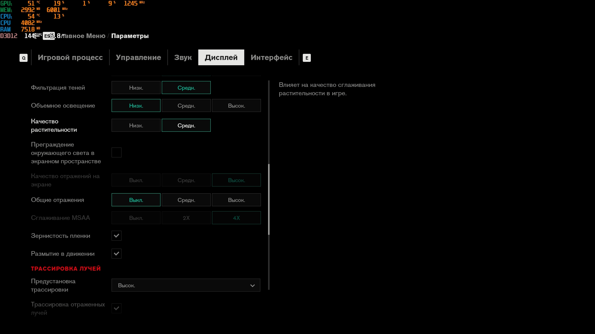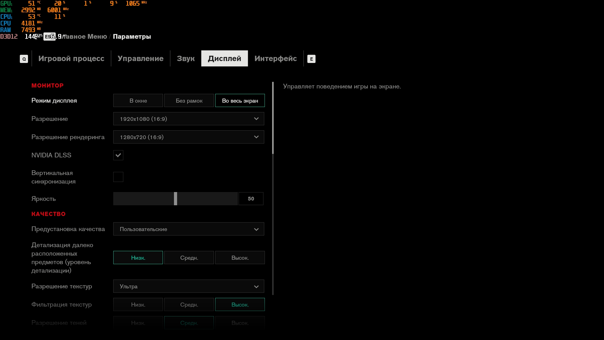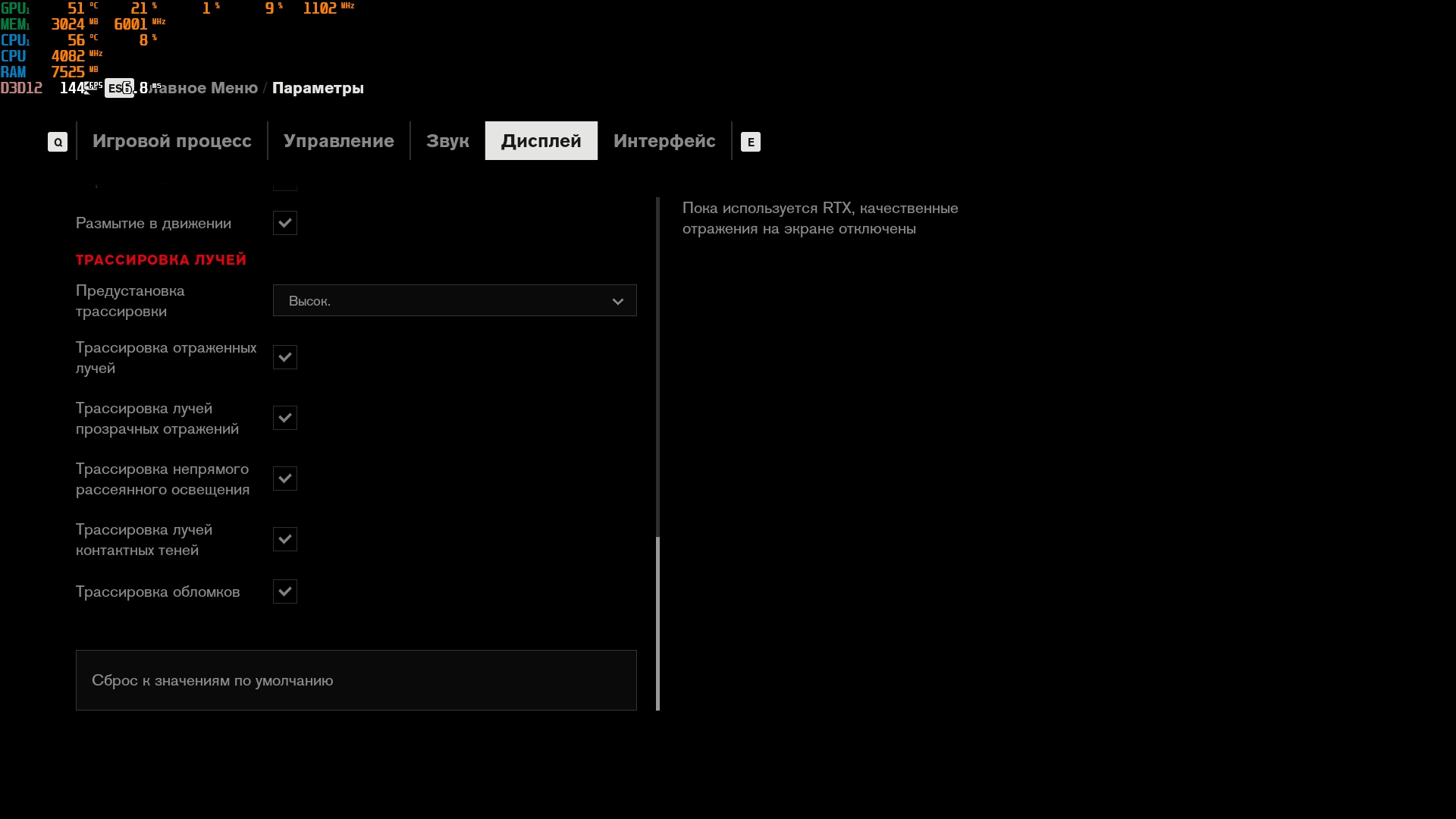 Konfiguracja laptopa pozwala na dość wygodne granie we wszelkie nowoczesne gry w natywnej rozdzielczości FullHD na średnich ustawieniach i uzyskanie przyzwoitych FPS-ów. Na przykład, Control na niskich/średnich ustawieniach, ale z ray tracingiem, działa z szybkością 40-50 FPS. God of War na średnich ustawieniach i DLSS w trybie jakości - od 60 do 80 FPS. Metro Exodus na wysokich ustawieniach z Ray Tracingiem, DLSS w trybie jakości bez teselacji i Hairworks jest utrzymywane w 60 FPS. The Ascent na maksymalnych ustawieniach, ale bez promieni - 90-110 FPS. Śledzenie natychmiast zmniejsza liczbę klatek na sekundę do około 20 FPS. Zrzuty ekranu z użytymi ustawieniami FPS i grafiki: