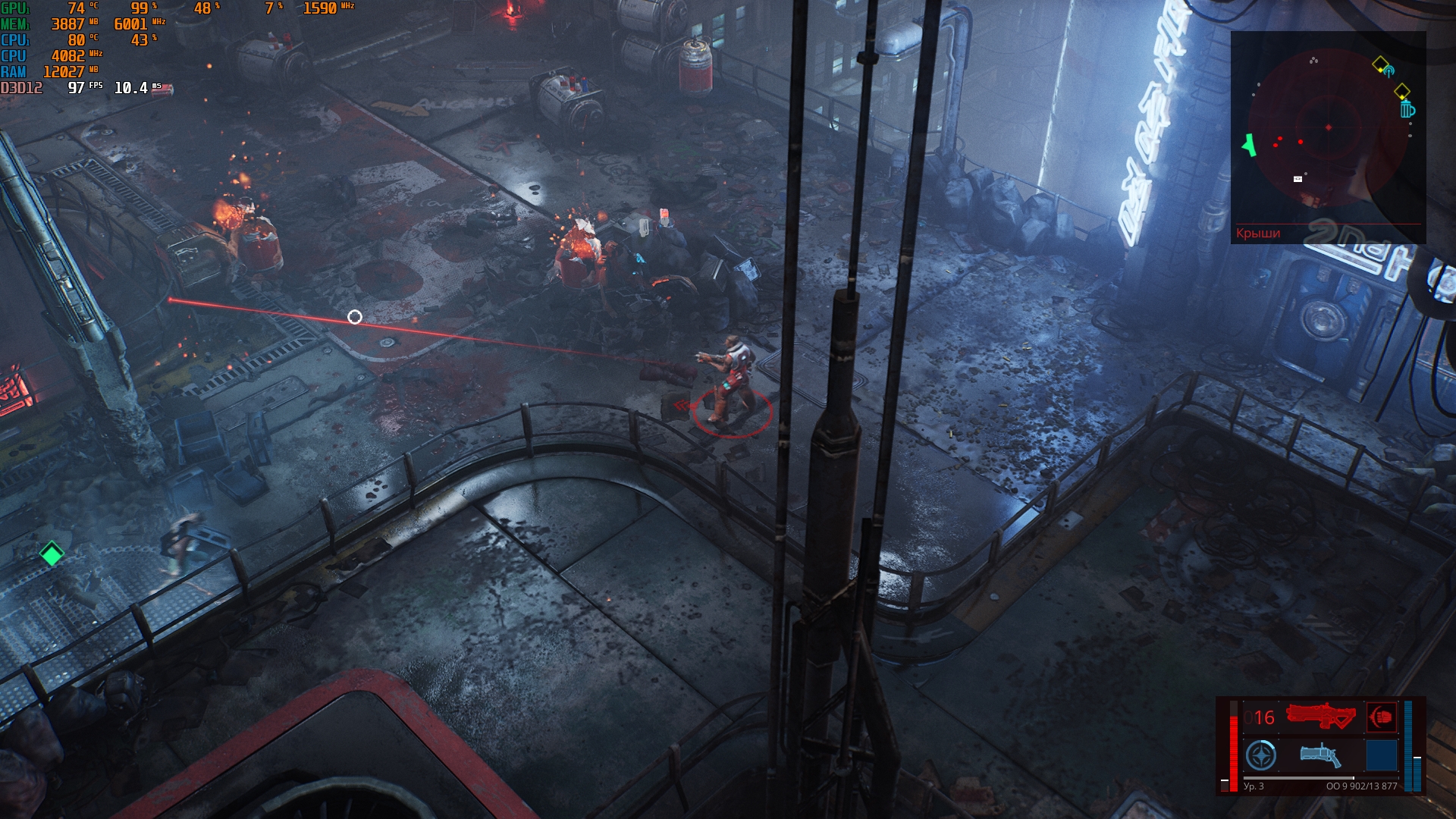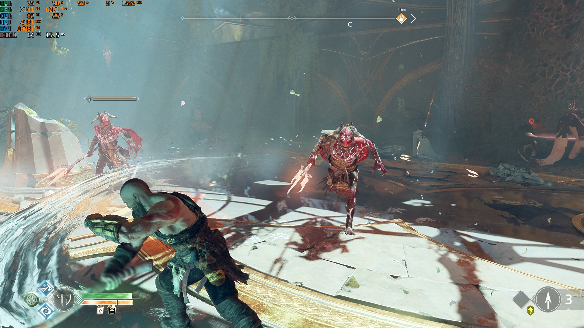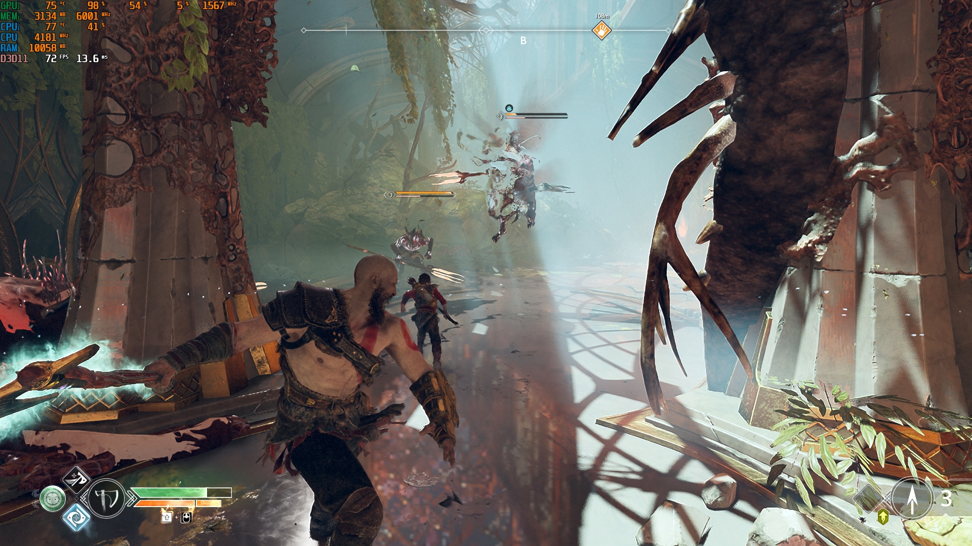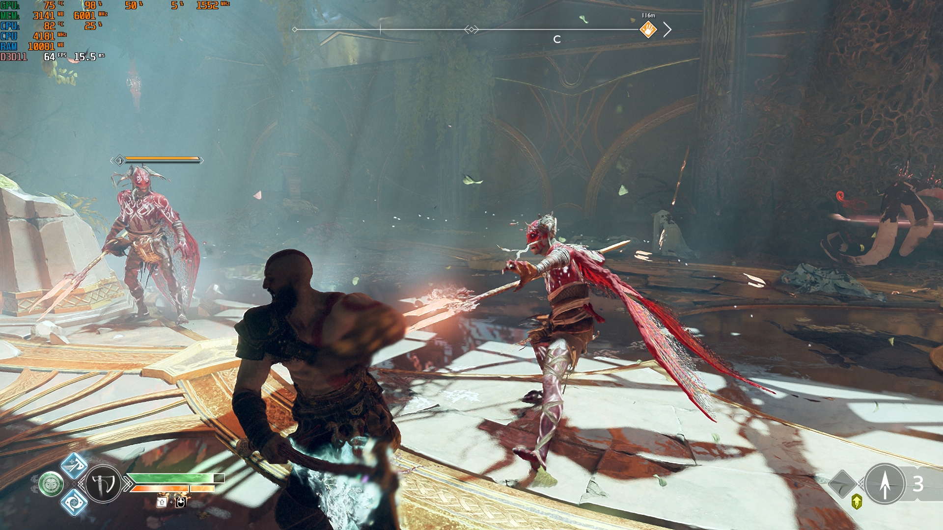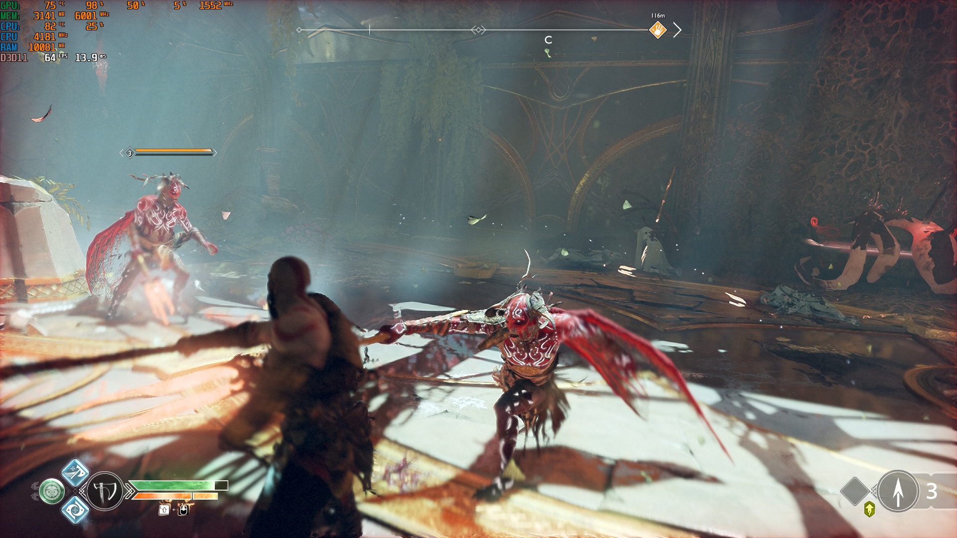 Konfiguracja laptopa pozwala na dość wygodne granie we wszelkie nowoczesne gry w natywnej rozdzielczości FullHD na średnich ustawieniach i uzyskanie przyzwoitych FPS-ów. Na przykład, Control na niskich/średnich ustawieniach, ale z ray tracingiem, działa z szybkością 40-50 FPS. God of War na średnich ustawieniach i DLSS w trybie jakości - od 60 do 80 FPS. Metro Exodus na wysokich ustawieniach z Ray Tracingiem, DLSS w trybie jakości bez teselacji i Hairworks jest utrzymywane w 60 FPS. The Ascent na maksymalnych ustawieniach, ale bez promieni - 90-110 FPS. Śledzenie natychmiast zmniejsza liczbę klatek na sekundę do około 20 FPS. Zrzuty ekranu z użytymi ustawieniami FPS i grafiki: