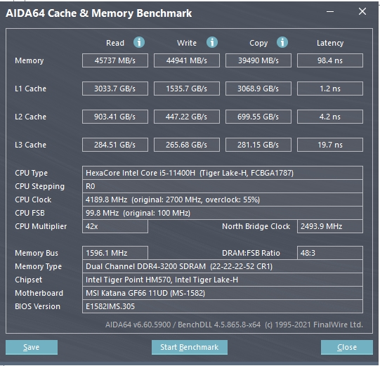 Laptopy MSI Katana GF66 wykorzystują aktualne procesory Intel 11. generacji. Nasza wersja ma procesor Intel Core i5-11400H. To sześciordzeniowy procesor Tiger Lake oparty na architekturze Willow Cove. Obsługuje 12 Hyper Threading i jest wytwarzany w procesie 10 nm SuperFin. Bazowe taktowanie to 2,7 GHz, maksymalna częstotliwość to aż 4,5 GHz, pamięć podręczna trzeciego poziomu to 12 MB, a TDP to 45 W. Jest zintegrowana karta graficzna UHD Intel o częstotliwości podstawowej 350 MHz i maksymalnie 1,45 GHz do niewymagających zadań. Jako osobna karta graficzna, laptop NVIDIA GeForce RTX 3050 Ti jest instalowany z podstawową częstotliwością 1222 MHz i przyspieszeniem do 1485 MHz. Ilość pamięci wideo to 4 GB GDDR6. Karta wideo oczywiście obsługuje ray tracing w czasie rzeczywistym i Resizable BAR (bezpośredni dostęp procesora do całej pamięci wideo przez PCI Express) w zaawansowanej konstrukcji MSI. Ilość pamięci RAM w naszej konfiguracji to 16 GB DDR4-3200, pracuje w trybie dwukanałowym. Pamięć nie jest lutowana, laptop ma dwa sloty RAM, ma dwa pendrive'y po 8 GB. Więc z czasem możesz go zastąpić na przykład dwoma urządzeniami o pojemności 16 GB.