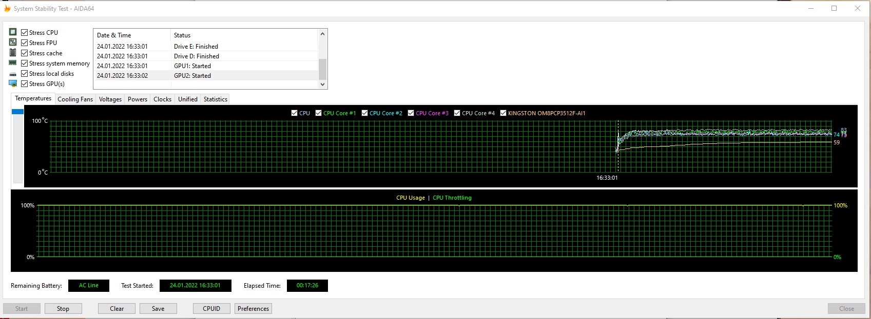 Cooler Boost 5 odpowiada za chłodzenie laptopa. zawiera 2 wentylatory, 6 rurek cieplnych i niezależny moduł termiczny dla CPU i GPU. Jednocześnie stosowane są rurki cieplne o cieńszych ściankach, dzięki czemu, możliwe było poszerzenie kanału wewnętrznego. Układ chłodzenia radzi sobie ze swoim zadaniem: nawet przy długotrwałych obciążeniach szczytowych, temperatura komponentów wewnątrz nie wzrasta powyżej 80-83 °. W związku z tym, nie obserwuje się trollingu. Obszar nad klawiaturą trochę się nagrzewa, podczas gdy reszta powierzchni roboczej pozostaje zimna. Pod względem poziomu hałasu, MSI Katana GF66 11UD to typowy laptop do gier. Tak, pod obciążeniem praca jest słyszalna, ale wszystko rozsądnych granicach.