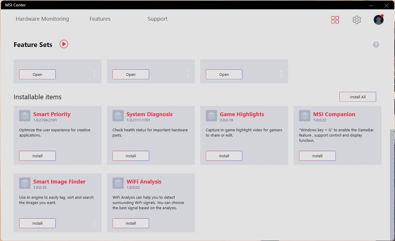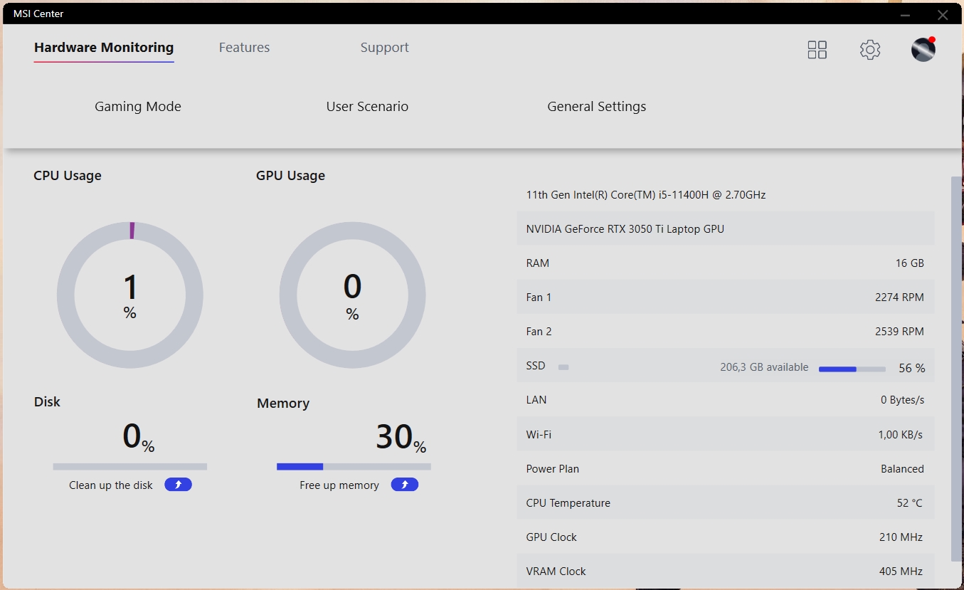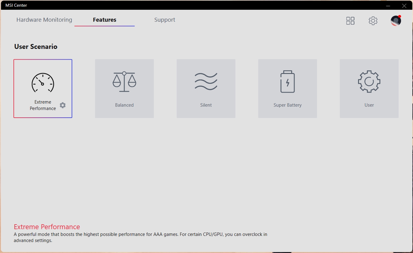 Z natywnego oprogramowania warto zwrócić uwagę na MSI Center. Aplikacja pozwala monitorować aktualny stan systemu, pobierać aktualizacje sterowników, przełączać tryby pracy: gamingowy, cichy, energooszczędny, zrównoważony, niestandardowy i ultrawydajny. W tym ostatnim, można na siłę włączyć tryb pracy CO z maksymalną prędkością. Chociaż, jak pokazała praktyka, w trybie automatycznym, urządzenie bez problemu radzi sobie z ogrzewaniem.