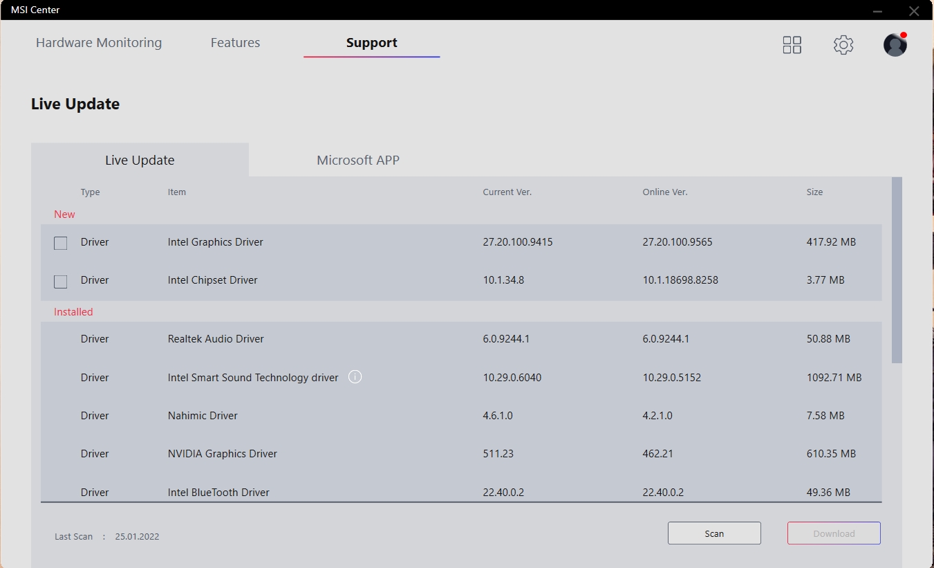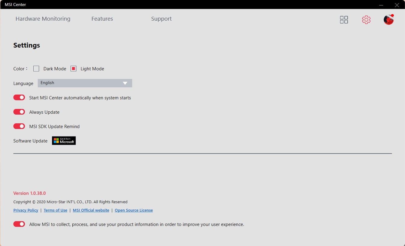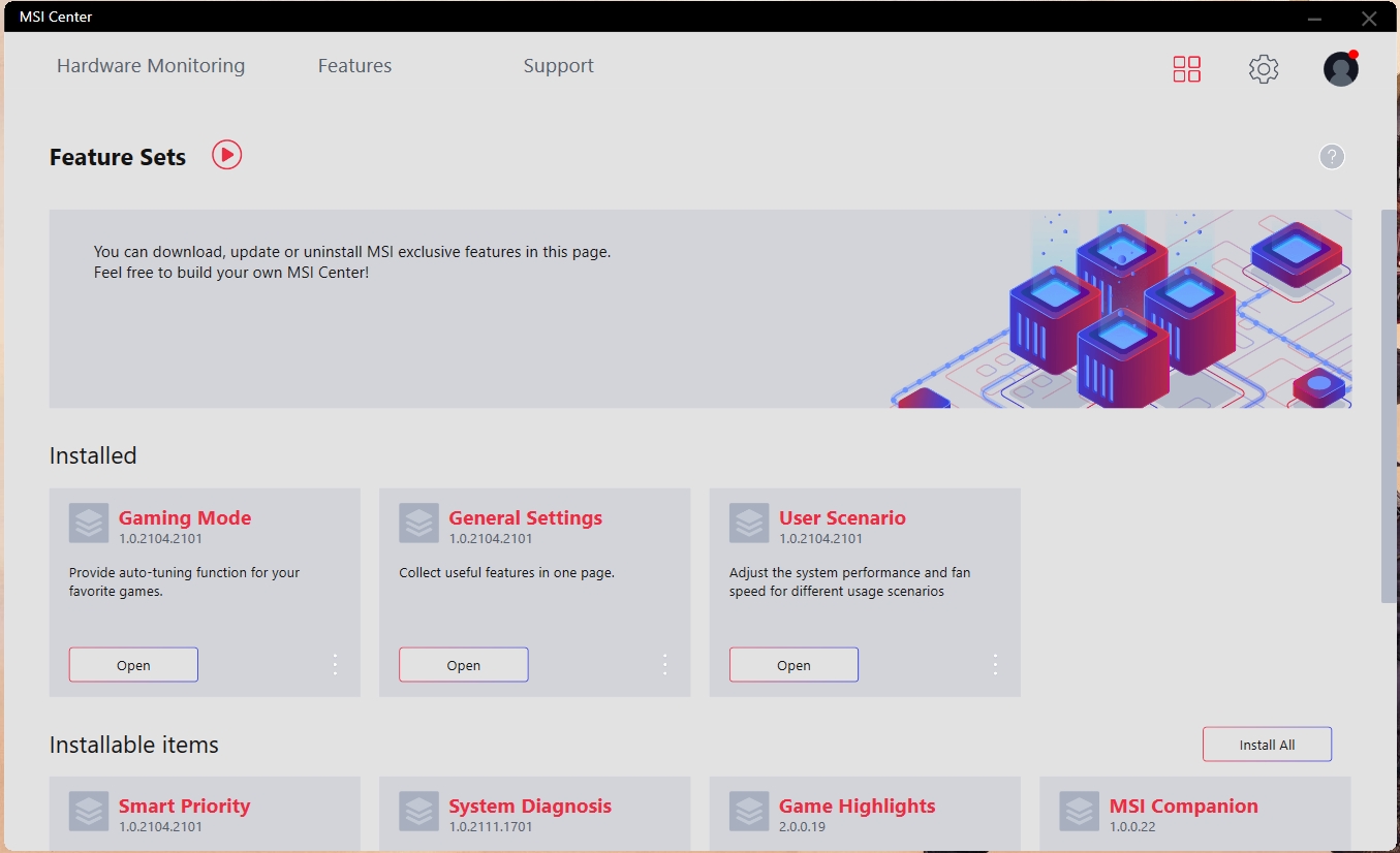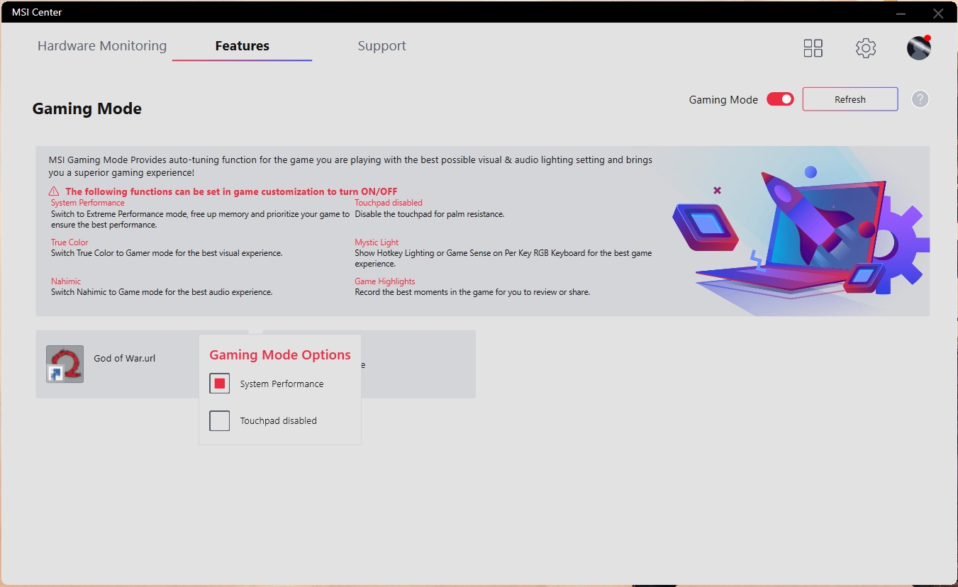Z natywnego oprogramowania warto zwrócić uwagę na MSI Center. Aplikacja pozwala monitorować aktualny stan systemu, pobierać aktualizacje sterowników, przełączać tryby pracy: gamingowy, cichy, energooszczędny, zrównoważony, niestandardowy i ultrawydajny. W tym ostatnim, można na siłę włączyć tryb pracy CO z maksymalną prędkością. Chociaż, jak pokazała praktyka, w trybie automatycznym, urządzenie bez problemu radzi sobie z ogrzewaniem.