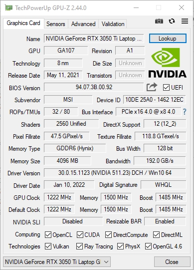 | Karta graficzna | Laptop nVidia GeForce RTX 3050 Ti, 4 GB GDDR6, grafika Intel UHD |