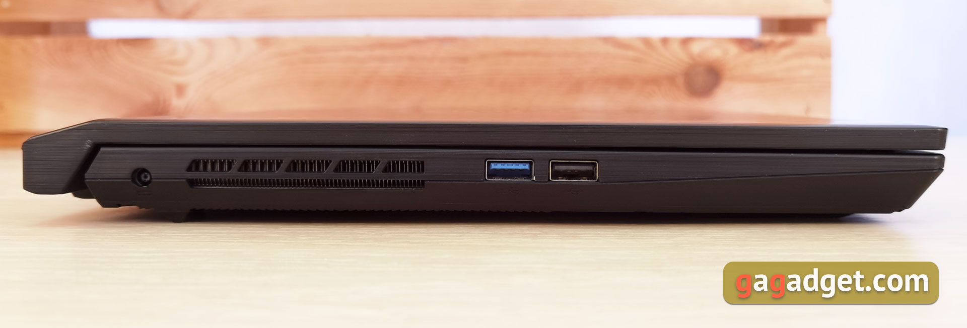 Po lewej stronie laptopa znajdują się otwory wentylacyjne, gniazdo do podłączenia zasilacza, a także pełnowymiarowe porty USB 3.2 Gen1 oraz USB 2.0:
