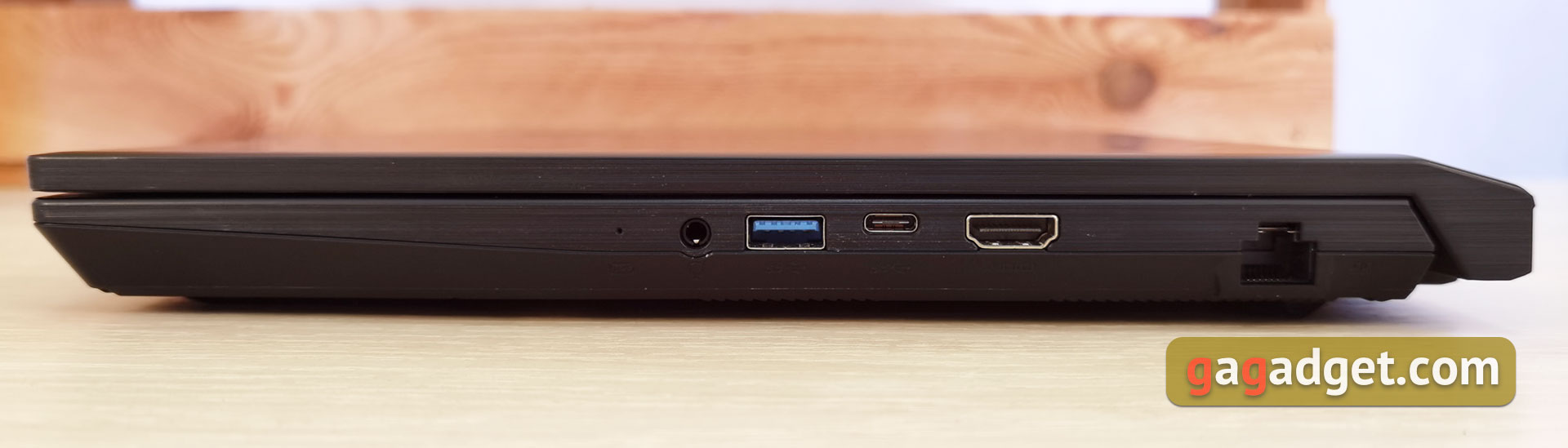 Po prawej stronie nie ma otworów wentylacyjnych, dzięki czemu, nie będzie nadmiaru gorącego powietrza nad dłonią z myszką. Złącza: audio 3,5 mm, HDMI (4K/60Hz), USB 3.2 Gen1 Type-C, pełnowymiarowe USB 3.2 Gen1 i RJ-45: