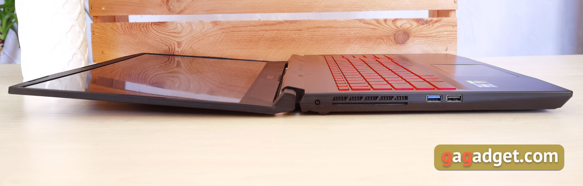 Zawias MSI Katana GF66 11UD umożliwia otwarcie laptopa jedną ręką. Jednocześnie maksymalny kąt to prawie 180 °. Wyświetlacz pozostaje stabilnym w każdej pozycji. Ale sam wyświetlacz, okazał się bardzo lekki i trochę się "trzęsie", jeśli zaczepisz go ręką.