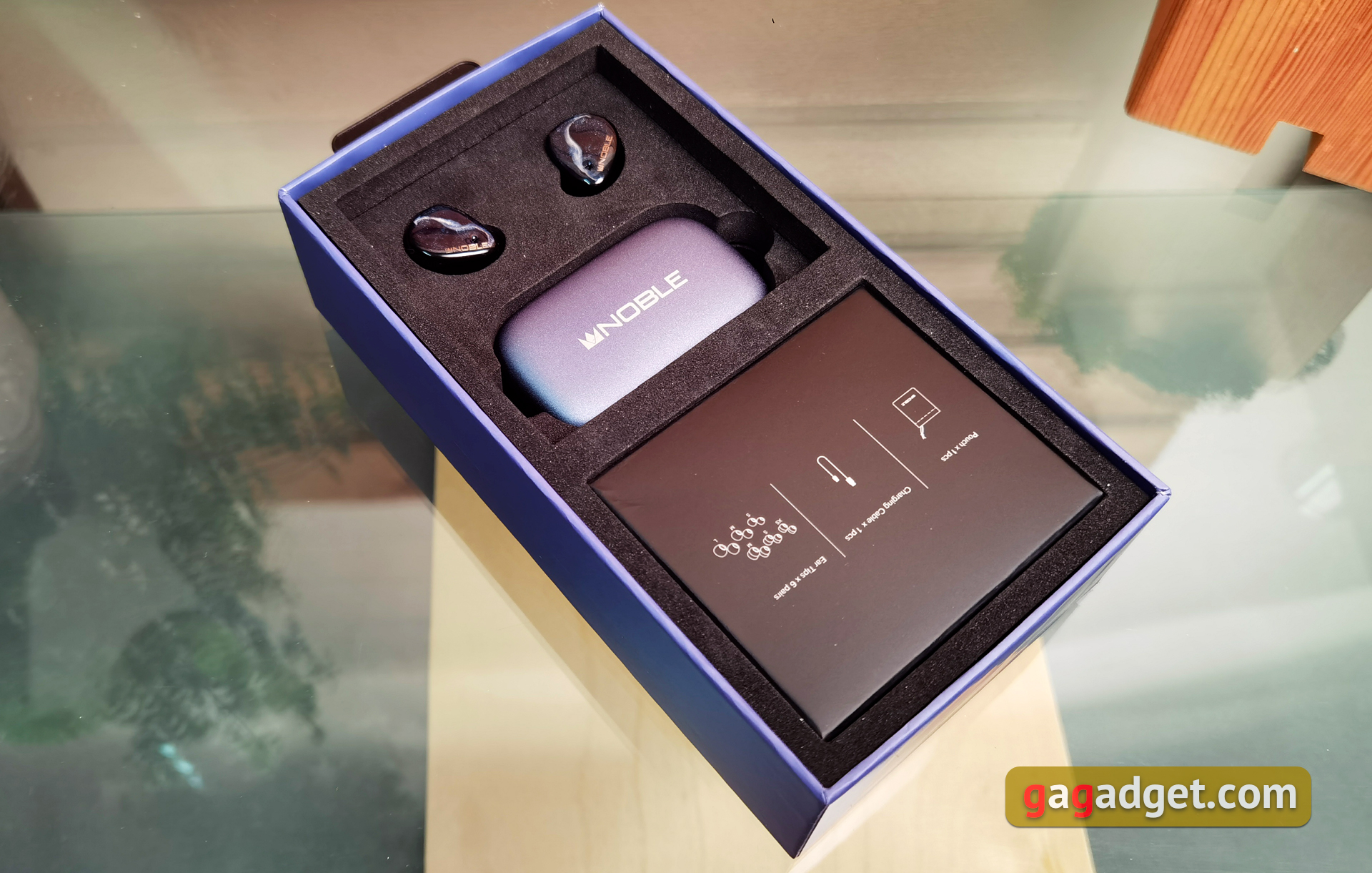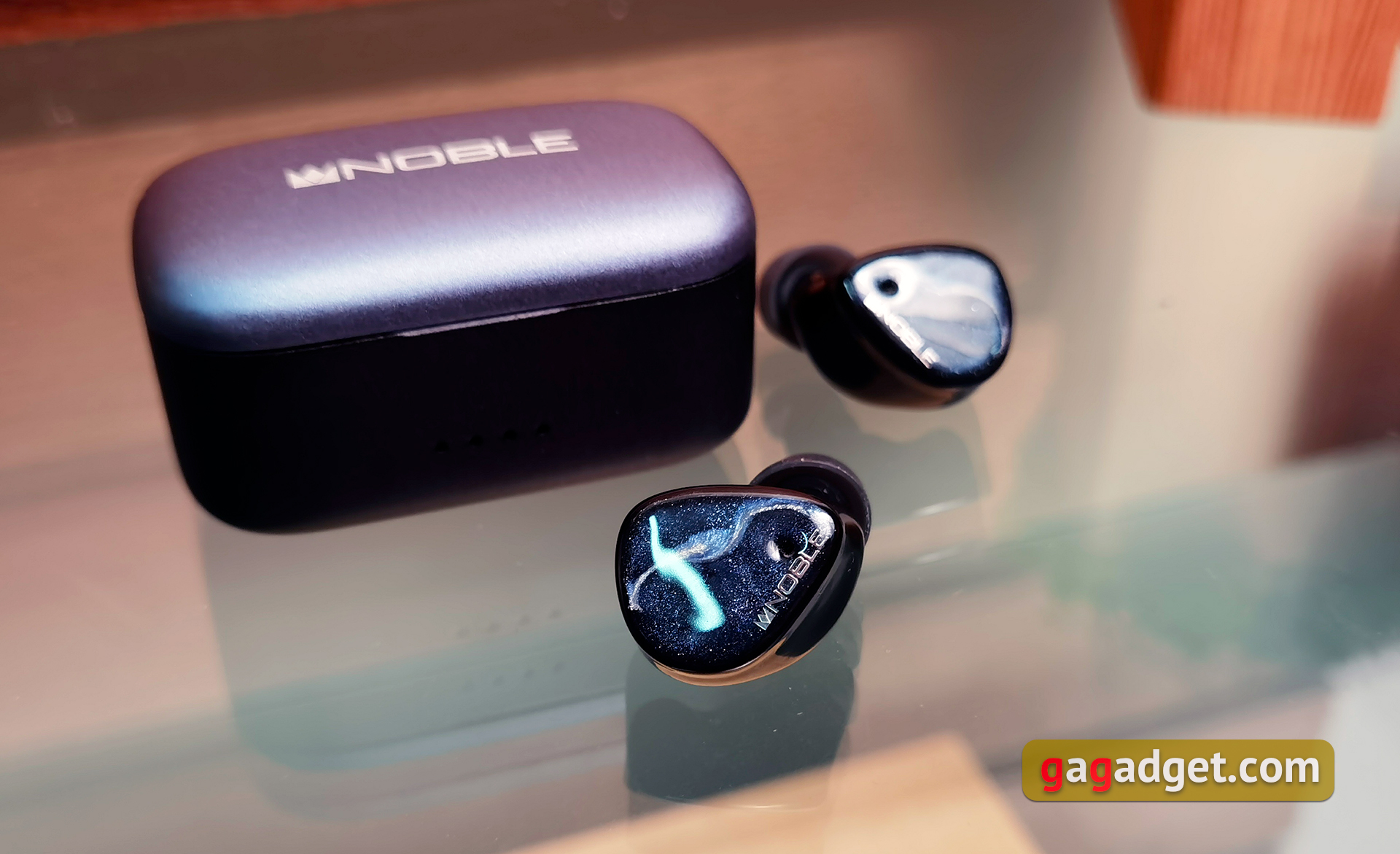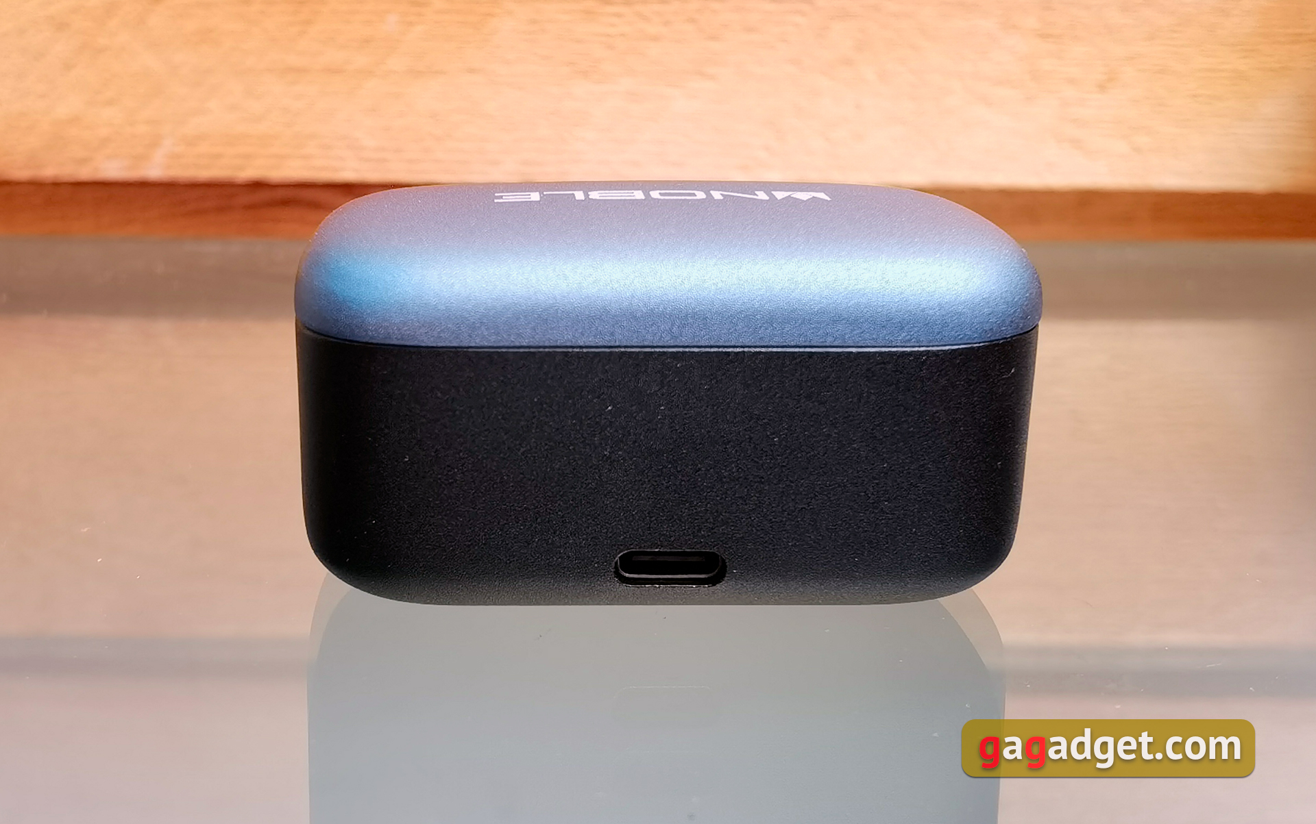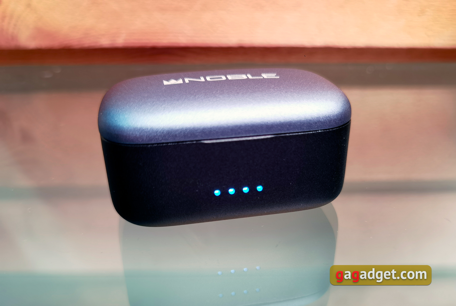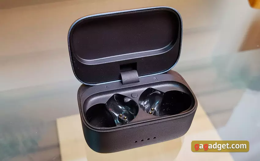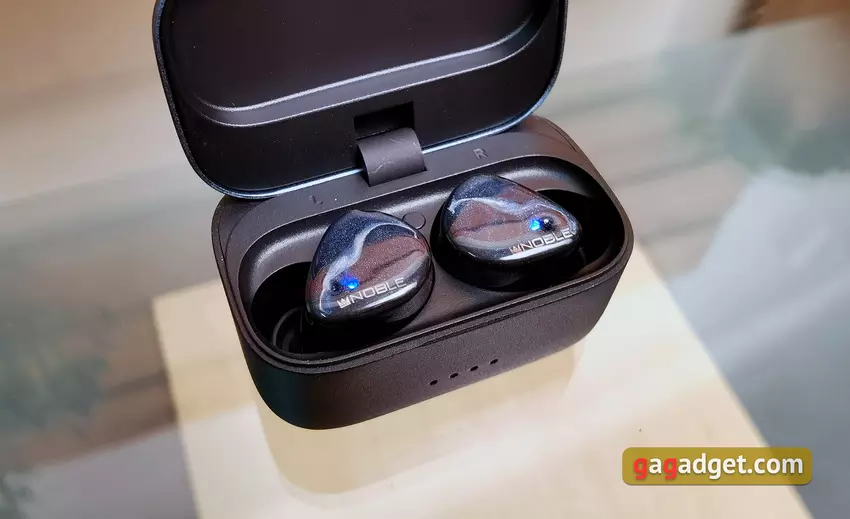 Wydaje się, że etui ładujące pozostało niezmienione. Jest dość duże i nie można go nosić w kieszeni. Ale trudno byłoby zrobić kompaktowe etui, biorąc pod uwagę rozmiar samych słuchawek i znajdującą się w nich baterię 500 mAh. Metalowa pokrywa jest niebieska z logo Noble Audio. Dolna część wykonana jest z czarnego matowego plastiku. Etui posiada cztery wskaźniki ładowania LED z przodu. Dwa zewnętrzne świecą się, gdy słuchawki są ładowane. Pokrywa jest mocowana za pomocą pojedynczego zawiasu. Posiada automatyczne wykończenie, ale tylko w pozycji zamkniętej. W górnej pozycji pokrywa nie jest zbyt dobrze zamocowana i trochę się trzęsie. Chociaż warto tutaj zauważyć, że do recenzji mieliśmy próbkę pokazową. Trudno powiedzieć ile i jak był używany. Wewnątrz znajdują się miejsca na słuchawki ze stykami, oznaczenia lewo-prawo i przycisk resetowania. Słuchawki są bardzo pewnie zamocowane i nie wypadną. Ale wyjęcie ich z etui to koszmar, zwłaszcza biorąc pod uwagę śliskie etui.