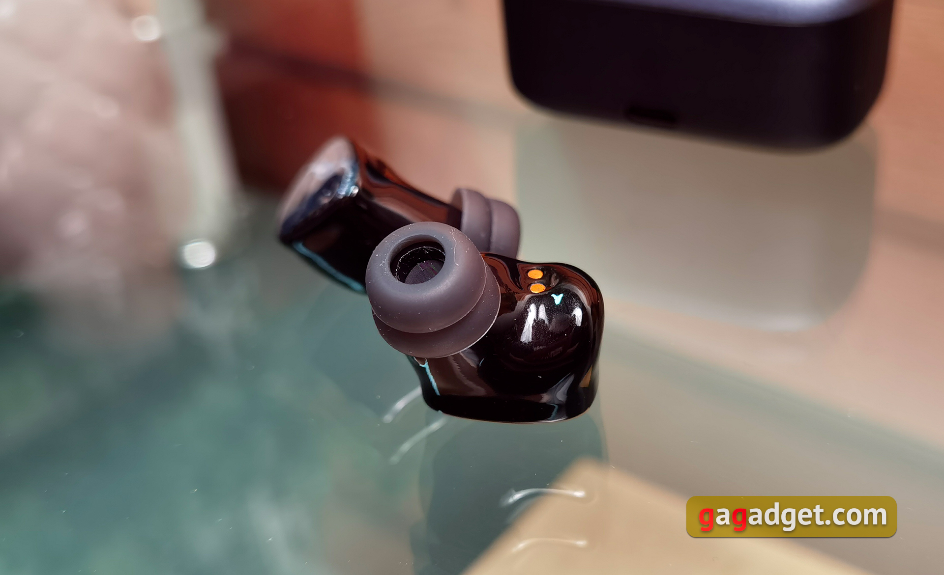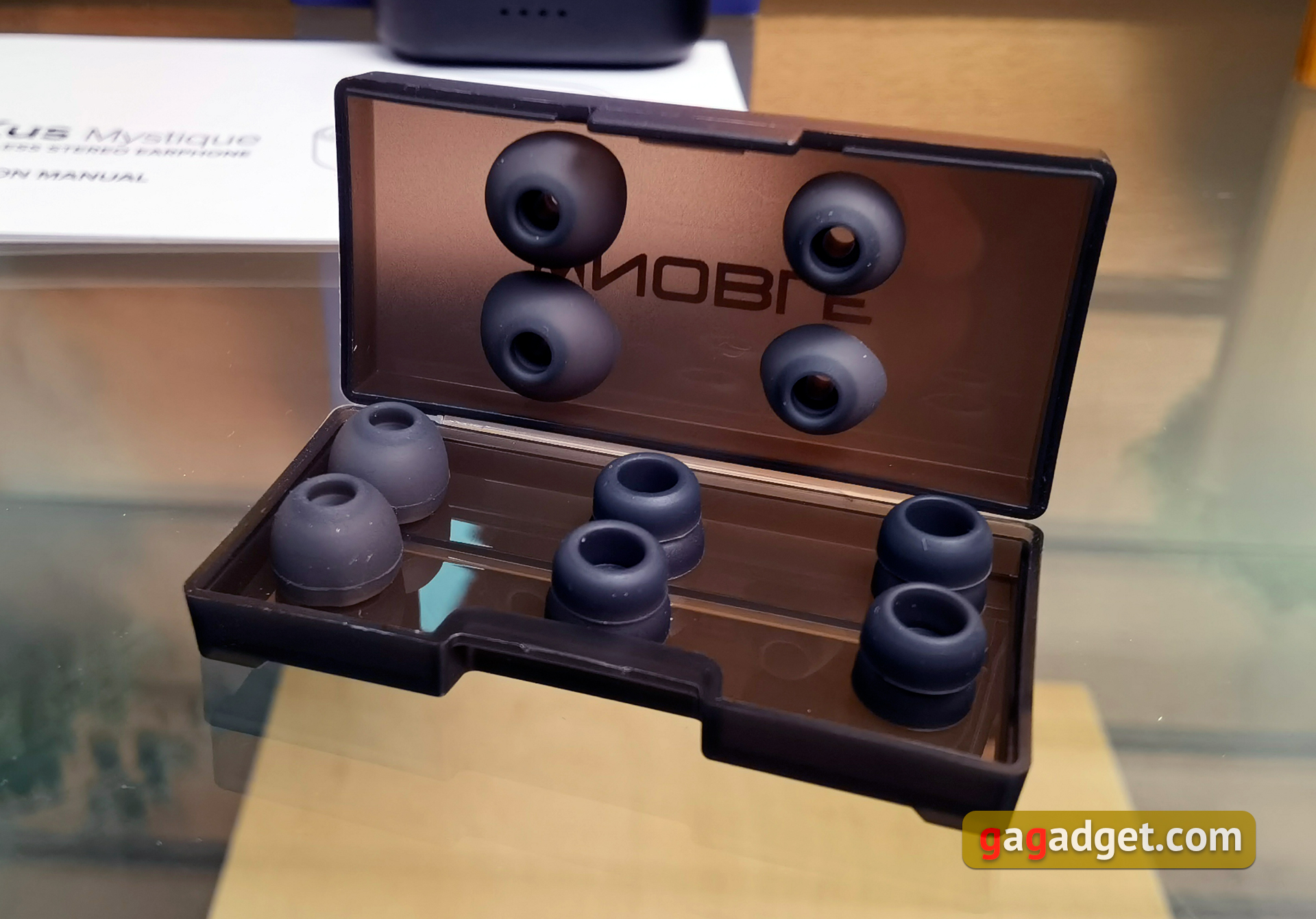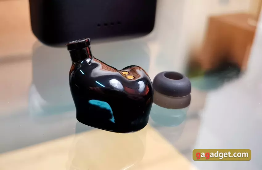 Prowadnice dźwięku są długie i mają niestandardową, nieco większą niż zwykle średnicę. Wewnątrz znajduje się siatka zapobiegająca przedostawaniu się brudu do środka. Na obwodzie znajdują się zgrubienia dla bardziej niezawodnego mocowania końcówek, a u podstawy znajdują się otwory kompensacyjne. Dysze innych firm nie będą pasować, więc nie należy tracić dołączonych.