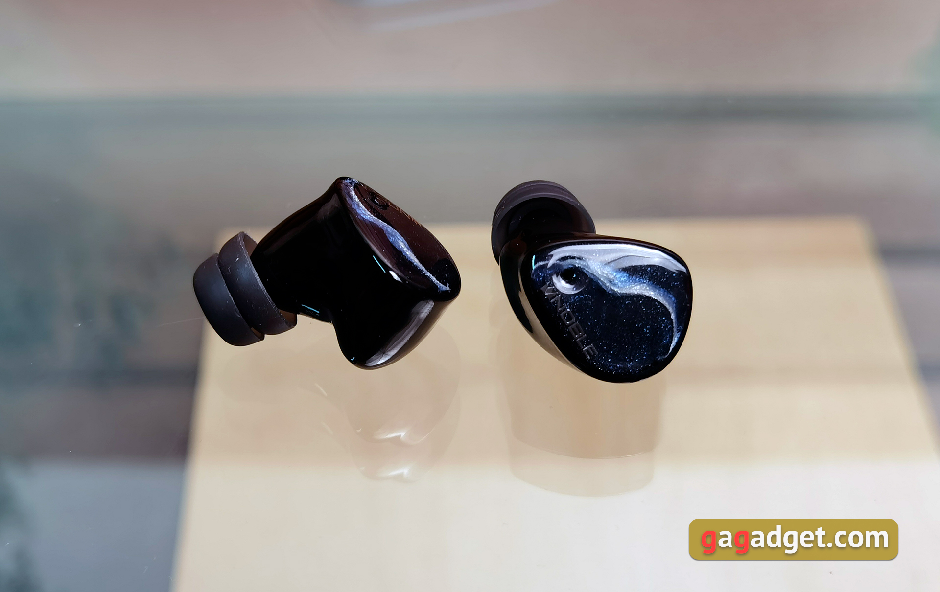 Obudowy Noble Audio FoKus Mystique są wykonane z akrylu na drukarce 3D i mają ergonomiczny, dość złożony kształt bez ostrych narożników, który jest bardzo podobny do drogich niestandardowych IEM. Są masywne, znacznie większe niż zwykłe słuchawki TWS. Płyty czołowe mają bardzo ciekawy design, który firma nazwała Deep Galaxy. Są one w kolorze ciemnoniebieskim z abstrakcyjnym wzorem, który naprawdę przypomina jakąś mgławicę w kosmosie. Na każdej słuchawce znajduje się również srebrne logo Noble Audio.