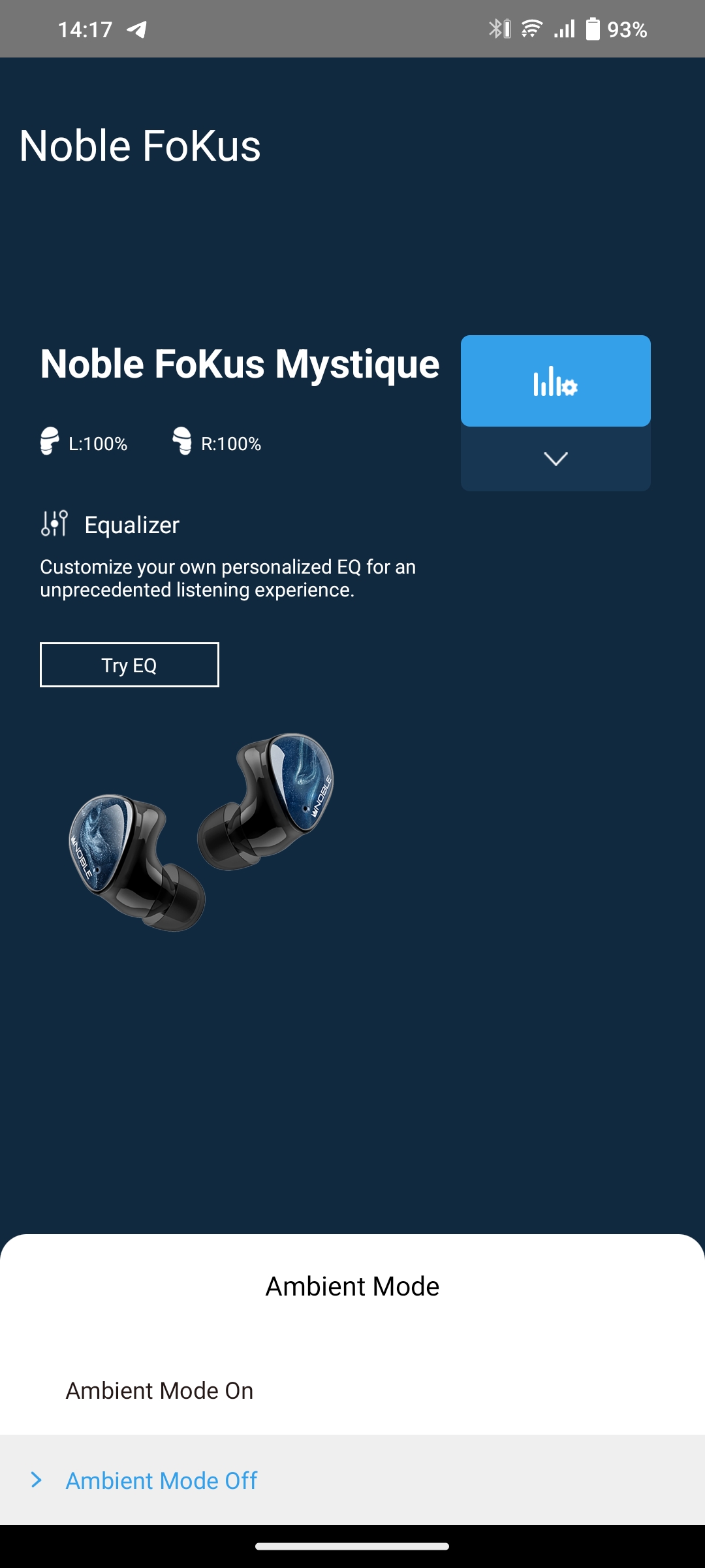 Aplikacja Noble FoKus została zaprojektowana do konfiguracji trzech modeli jednocześnie: Noble Audio FoKus Mystique, FoKus Pro i FoKus H-ANC. Główny ekran aplikacji wyświetla poziom naładowania każdych słuchawek i posiada elementy sterujące odtwarzaniem. Wśród nowych funkcji (w porównaniu do FoKus Pro) jest tryb przezroczystości: dźwięk z mikrofonów jest przesyłany do słuchawek. Jest to bardzo przydatna funkcja, gdy trzeba porozmawiać z kimś na ulicy lub w sklepie. Lub po prostu nie chcesz całkowicie odciąć się od otaczającego Cię świata. W rozwijanym menu znajduje się kilka sekcji. Najciekawszą z nich jest autorski 10-pasmowy korektor, który można regulować ręcznie, wybierać spośród istniejących ustawień wstępnych lub tworzyć na podstawie własnego słuchu. Słuchawki odbierają 1, 2 lub 3 krótkie sygnały w różnych pasmach częstotliwości. Należy określić, ile sygnałów było słyszanych. Po pokryciu całego zakresu aplikacja generuje indywidualny korektor. W osobnej sekcji można skonfigurować sterowanie dotykowe: podwójne i potrójne dotknięcie. Osobna sekcja dotyczy wyboru języka, ustawień głośności, ANC Display (w tym przypadku Ambient Mode) i Promt Tone Switch. Działanie tej funkcji było tajemnicą od czasów FoKus Pro. Osobną pozycją w menu jest aktualizacja oprogramowania układowego. Ogólnie rzecz biorąc, aplikacja jest łatwa w użyciu i ma wszystko, czego potrzebujesz.