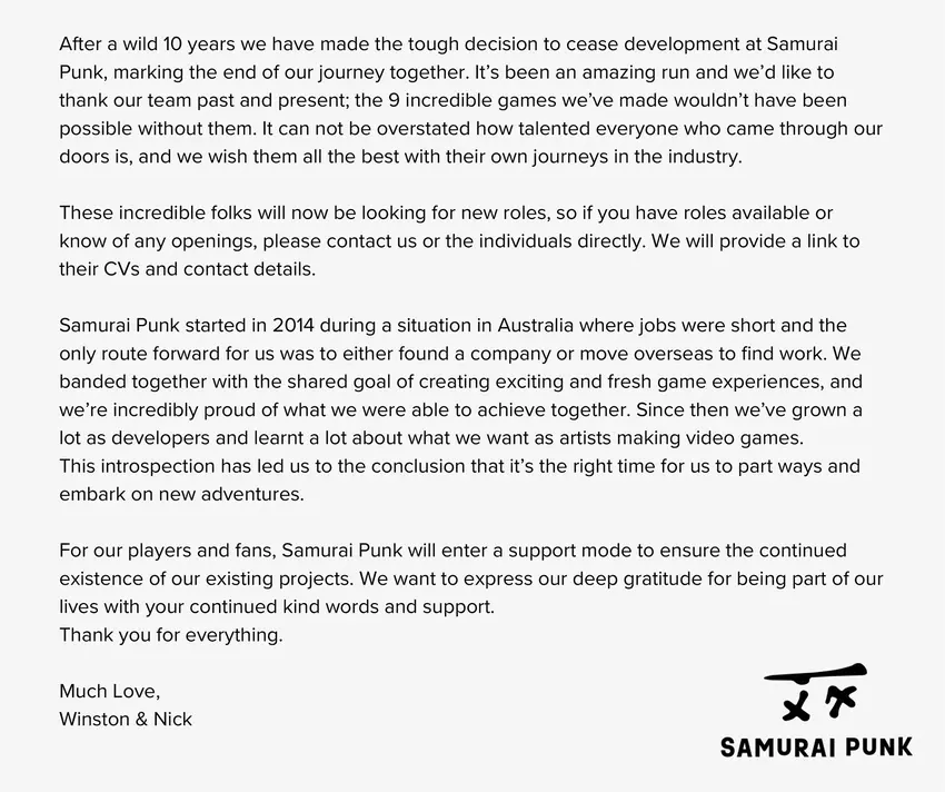Samurai Punk zachowa również wsparcie dla swoich gier, aby "zapewnić dalsze istnienie" swoich projektów.