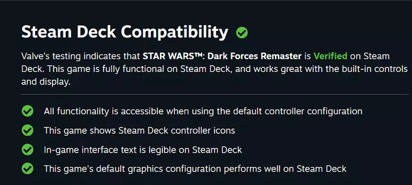 Na stronie Steamodświeżonej wersji Star Wars: Dark For ces dostrzeżono oznaczenie, które informuje, że gra jest w pełni kompatybilna z Steam Deck, a jej działanie na przenośnej konsoli zostało zweryfikowane przez inżynierów Valve i Nightdive Studios.