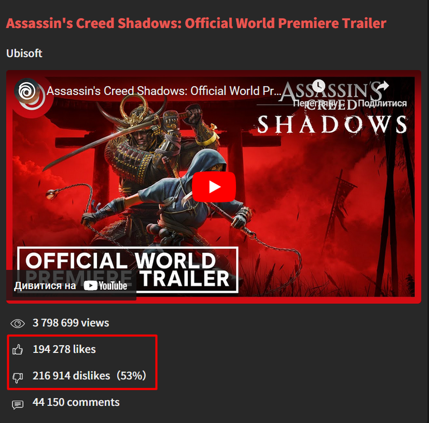 Po pokazie Assassin's Creed Shadows gracze podzielili się na dwa obozy: zwiastun otrzymał 194 tysiące polubień, ale ponad 215 tysięcy niechęci