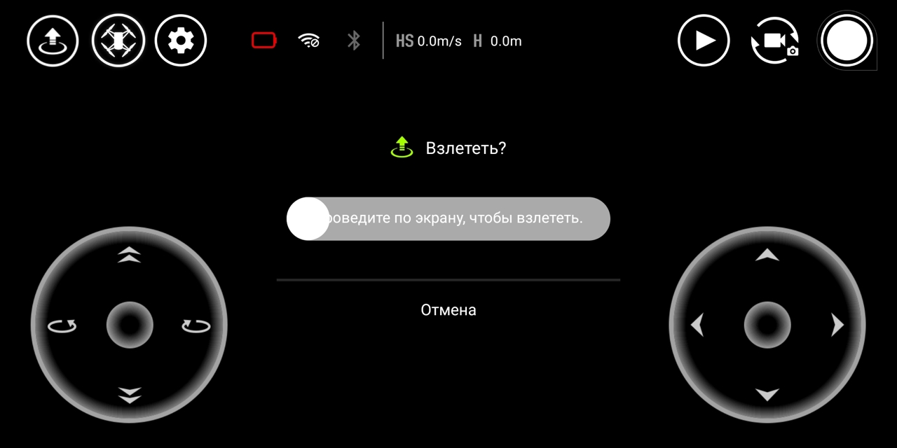 Interfejs aplikacji do sterowania dronem jest bardzo prosty, zwłaszcza że jest tłumaczony na rosyjski - każde dziecko zrozumie. Dwa joysticki nawigacyjne służą do latania i skręcania. Możesz wybrać jedną z dwóch opcji prezentacji. Użyłem standardowego, w którym lewy joystick steruje startem / lądowaniem i skręcaniem, a prawy porusza się w przód i w tył, w lewo i prawo (w stosunku do kamery drona, to znaczy, jeśli kamera patrzy na ciebie, a następnie po naciśnięciu lewego klawisza przeleci w prawo) od pilota).